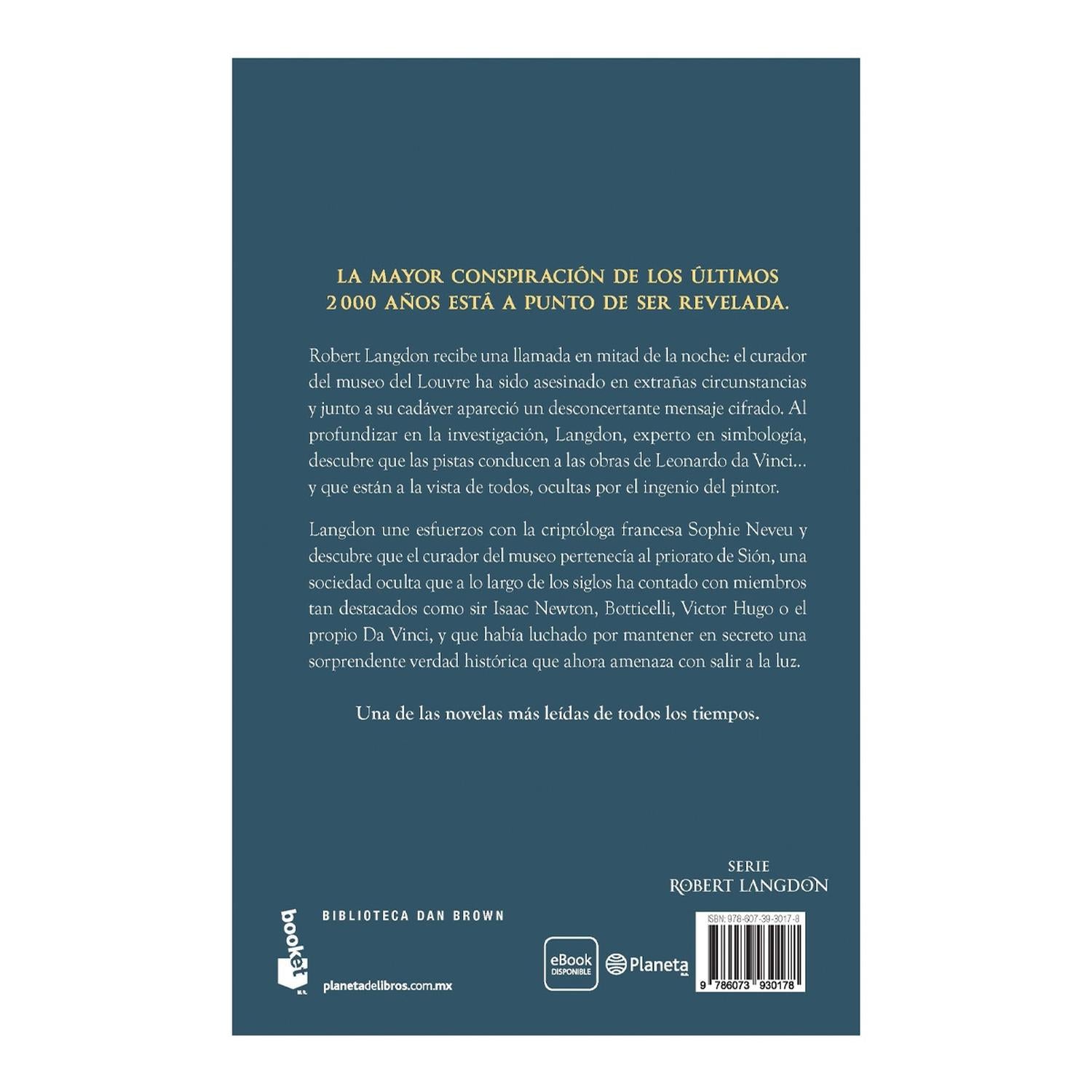 Descripción: La mayor conspiración de los últimos 2000 años está a punto de ser desvelada. Robert Langdon recibe una llamada en mitad de la noche: el conservador del museo del Louvre ha sido asesinado en extrañas circunstancias y junto a su cadáver ha aparecido un desconcertante mensaje cifrado. Al profundizar en la investigación, Langdon, experto en simbología, descubre que las pistas conducen a las obras de Leonardo Da Vinci… y que están a la vista de todos, ocultas por el ingenio del pintor. Langdon une esfuerzos con la criptóloga francesa Sophie Neveu y descubre que el conservador del museo pertenecía al priorato de Sión, una sociedad que a lo largo de los siglos ha contado con miembros tan destacados como sir Isaac Newton, Botticelli, Victor Hugo o el propio Da Vinci, y que ha velado por mantener en secreto una sorprendente verdad histórica. Una mezcla trepidante de aventuras, intrigas vaticanas, simbología y enigmas cifrados que provocó una extraordinaria polémica al poner en duda algunos de los dogmas sobre los que se asienta la Iglesia católica. Una de las novelas más leídas de todos los tiempos.