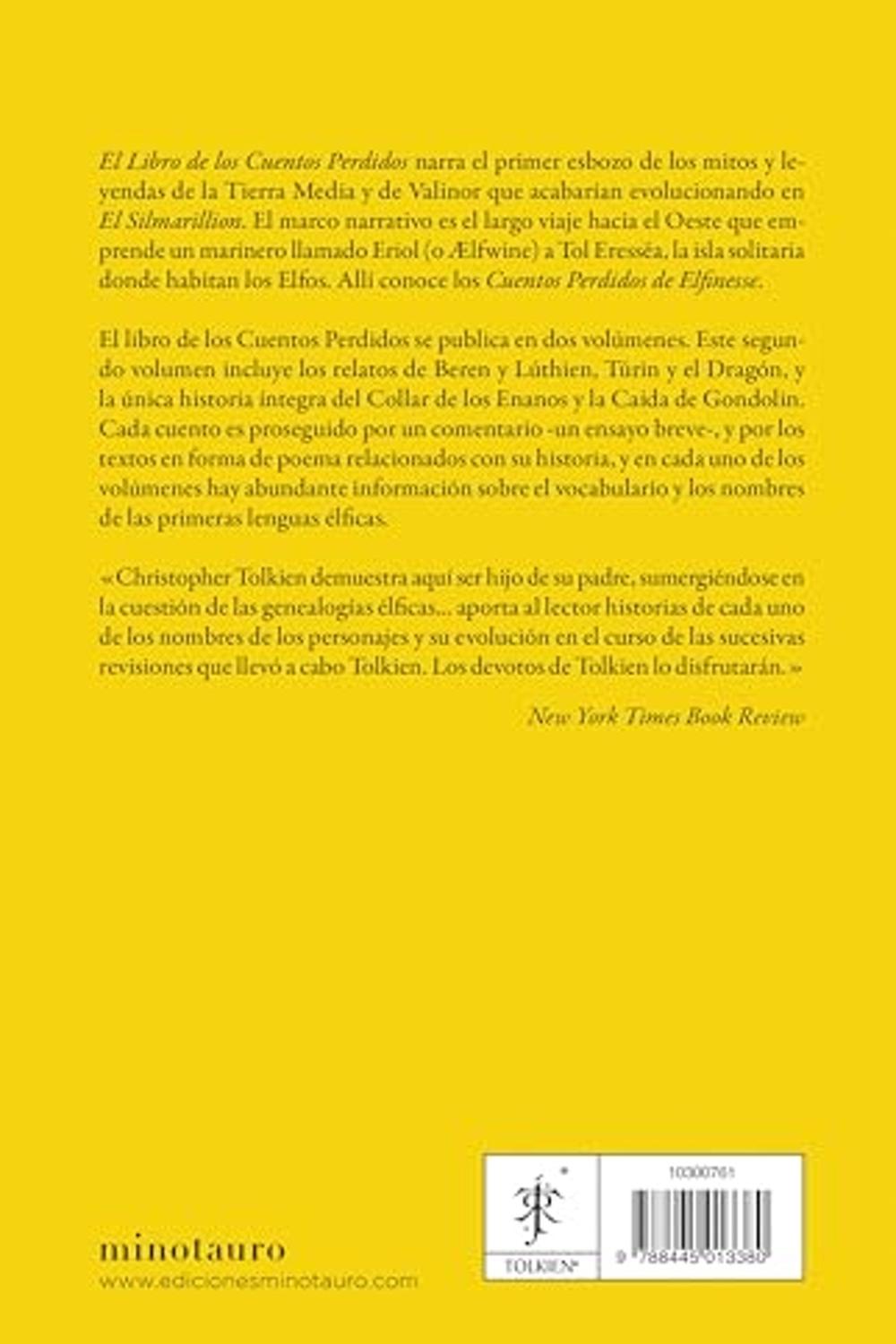 Descripción: El principio de toda la concepción de la Tierra Media El Libro de los Cuentos Perdidos fue la primera gran obra de imaginación de J.R.R. Tolkien, comenzada en 1916-1917, cuando tenía veinticinco años, y abandonada varios años después. Es en realidad el principio de toda la concepción de la Tierra Media y Valinor, y el primer esbozo de los mitos y leyendas que constituirían El Silmarillion. El marco narrativo es el largo viaje hacia el Oeste que emprende un marinero llamado Eriol (Aelfwíne) a Tol Eressëa, la isla solitaria donde habitan los Elfos. Allí conoce los Cuentos Perdidos de Elfenesse, en los que aparecen las ideas y concepciones más tempranas sobre los Dioses y los Elfos, los Enanos, los Balrogs y los Orcos, los Silmarils, los dos árboles de Valinor, Nargothrond y Gondolin, y la geografía y la cosmología de la Tierra Media. El libro de los Cuentos Perdidos se publica en dos volúmenes. Este segundo volumen incluye Beren y Lúthien, Túrin y el Dragón, y las historias del Collar de los Enanos y la Caída de Gondolin. Cada cuento es seguido de un comentario -un ensayo breve-, y de algún poema relacionado con el texto, y en cada uno de los volúmenes hay abundante información sobre el vocabulario y los nombres de las primeras lenguas élficas.