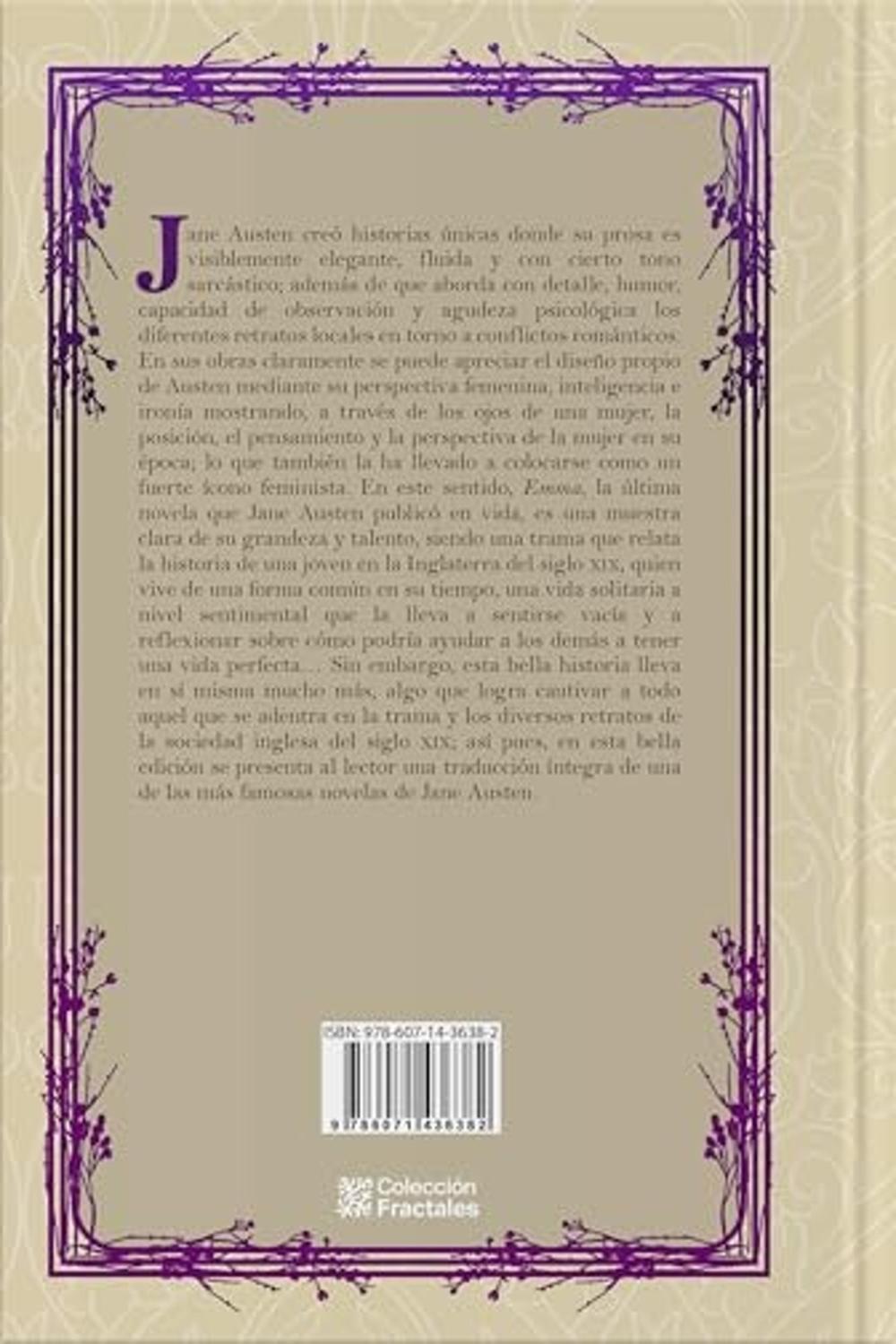 Descripción: Jane Austen creo historias únicas donde su prosa es visiblemente elegante, fluida y con cierto tono sarcástico; además de que aborda con detalle, humor, capacidad de observación y agudeza psicológica, los diferentes retratos locales en torno a conflictos románticos. En sus obras claramente se puede apreciar el diseño propio de Austen mediante su perspectiva femenina, inteligencia e ironía mostrando, a través de los ojos de una mujer, la posición, el pensamiento y la perspectiva de la mujer de la época, lo que ha llevado a colocarse como un fuerte icono feminista. En este sentido, Emma, La última novela de Jane Austen público en vida, es una muestra clara de su grandeza y talento, siendo una trama que relata la historia de una joven en la Inglaterra del siglo XIX, quien vive de una forma común en su tiempo, una vida solitaria a nivel sentimental que la lleva sentirse vacía y a reflexionar sobre cómo podría ayudar a los demás a tener una vida perfecta… sin embargo, esta bella historia lleva en si misma mucho más, algo que logra cautivar a todo aquel que se adentra en la trama y los diversos retratos de la sociedad inglesa del siglo XIX; así pues, en esta bella edición se presenta al lector una traducción íntegra de una de las más famosas novelas de Jane Austen