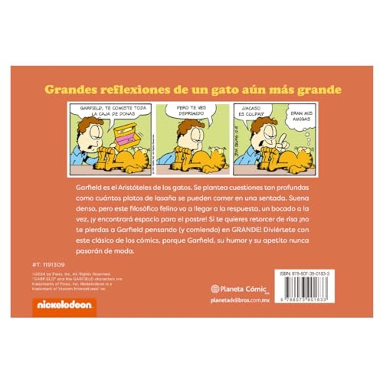 Descripción: Grandes reflexiones de un gato aún más grande Garfield es el Aristóteles de los gatos. Se plantea cuestiones tan profundas como cuántos platos de lasaña se pueden comer en una sentada. Suena denso, pero este filosófico felino va a llegar a la respuesta, un bocado a la vez ¡y encontrará espacio para el postre! Si te quieres retorcer de risa ¡no te pierdas a Garfield pensando (y comiendo) en GRANDE! Diviértete con este clásico de los cómics, porque Garfield, su humor y su apetito nunca pasarán de moda.