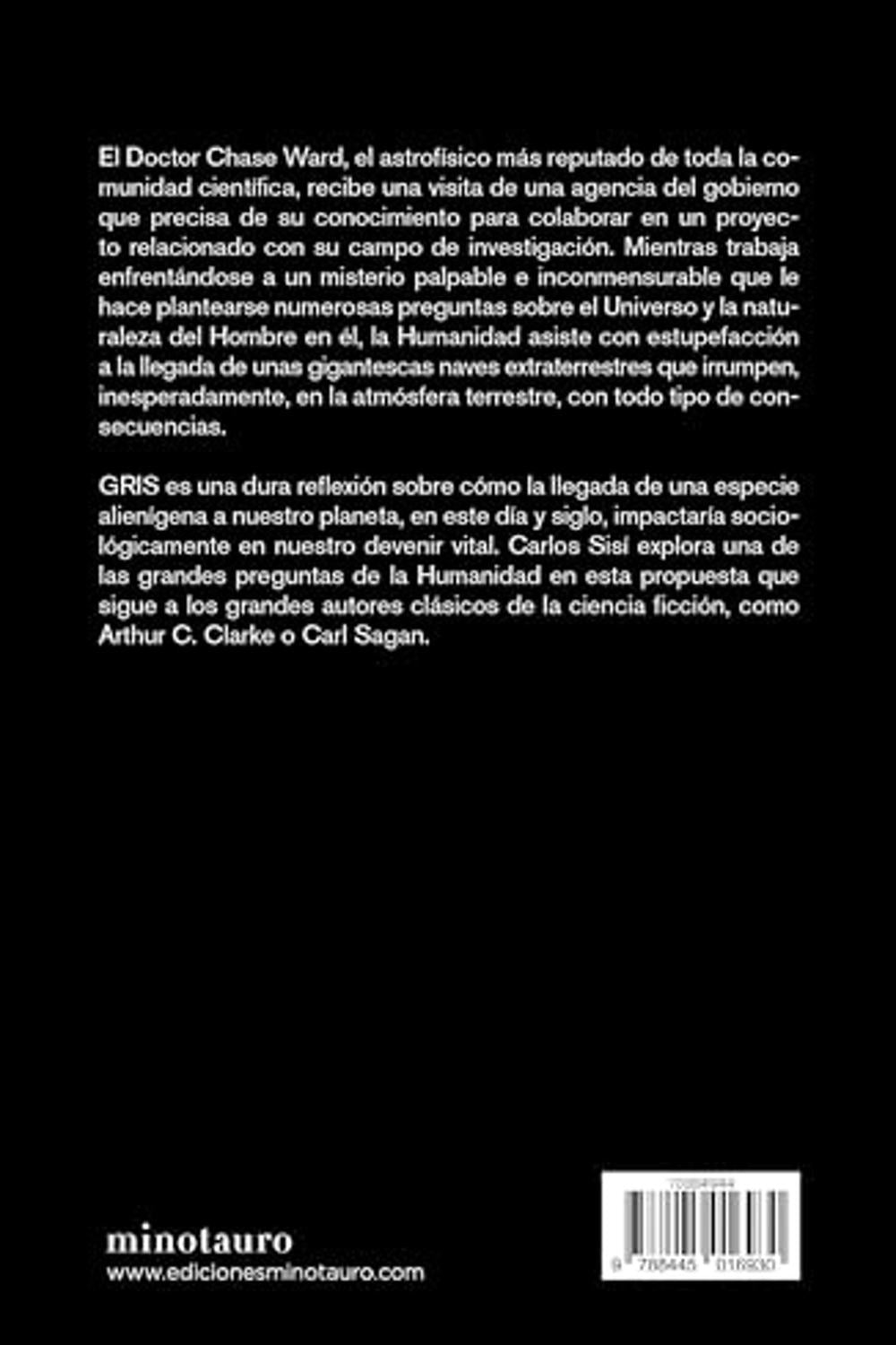 Descripción: La nueva apuesta de Carlos Sisí (Los caminantes, Rojo). El Doctor Chase Ward, el astrofísico más reputado de toda la comunidad científica, recibe una visita de una agencia del gobierno que precisa de su conocimiento para colaborar en un proyecto relacionado con su campo de investigación. Mientras trabaja enfrentándose a un misterio palpable e inconmensurable que les hace plantearse numerosas preguntas sobre el Universo y la naturaleza del Hombre en él, la Humanidad asiste con estupefacción a la llegada de unas gigantescas naves extraterrestres que irrumpen, inesperadamente, en la atmósfera terrestre, con todo tipo de consecuencias. GRIS es una dura reflexión sobre cómo la llegada de una especie alienígena a nuestro planeta, en este día y siglo, impactaría sociológicamente en nuestro devenir vital.
