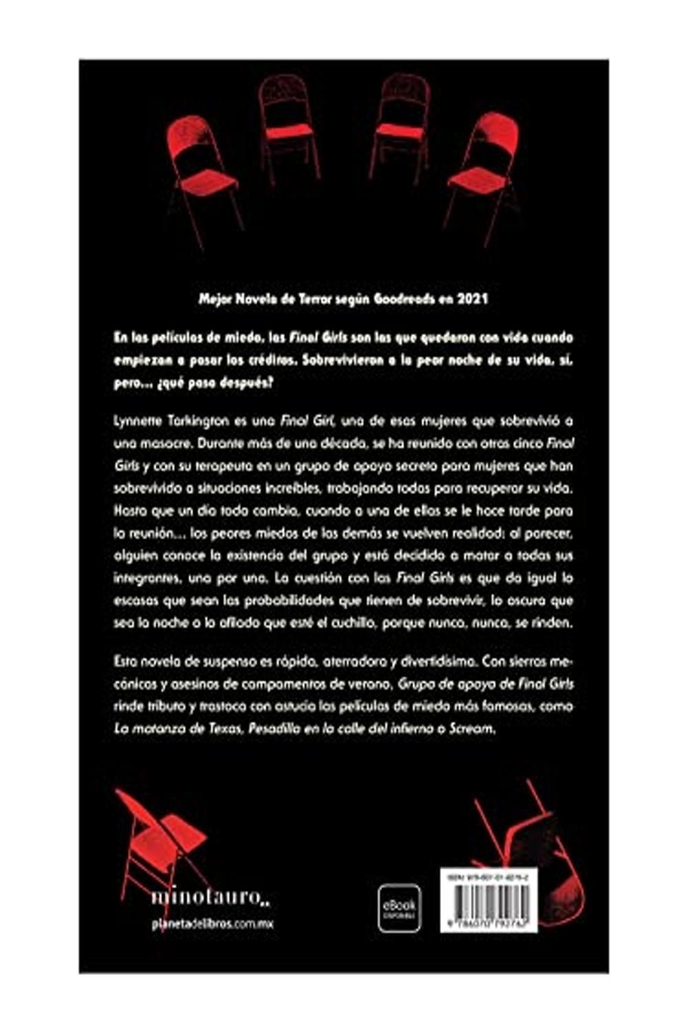 Descripción: En las películas de miedo, las Final Girls son las que han quedado con vida cuando empiezan a pasar los títulos de créditos. Han sobrevivido a la peor noche de su vida, sí, pero… ¿qué sucede luego? Lynnette Tarkington es una Final Girl, una de esas que sobrevivió a una masacre. Durante más de una década, ha estado reuniéndose con otras cinco Final Girls y con su terapeuta en un grupo de apoyo secreto para mujeres que han sobrevivido a situaciones increíbles, trabajando todas ellas para recuperar su vida. Entonces, un día, una de ellas parece que llegue tarde a la reunión… hasta que los peores miedos de las demás se hacen realidad: al parecer, alguien conoce la existencia del grupo y está decidido a asesinar a todas sus integrantes, una a una. La cuestión con las Final Girls es que da igual lo bajas que sean las probabilidades que tienen de sobrevivir, lo oscura que sea la noche o lo afilado que esté el cuchillo, porque nunca, nunca, se rinden. · Obra ganadora del premio Mejor Novela de Terror otorgado por Goodreads en 2021. · «El maestro del terror […] les da un giro único a los tropos de las películas de cuchilladas», USA Today. · «Sus personajes son divertidos y reales, aunque alguno de ellos debería perder una extremidad en algún momento», The New York Times. · «Se trata de una novela de suspense espolvoreada con humor negro que le da una vuelta a la cultura popular», Publisher’s Weekly.