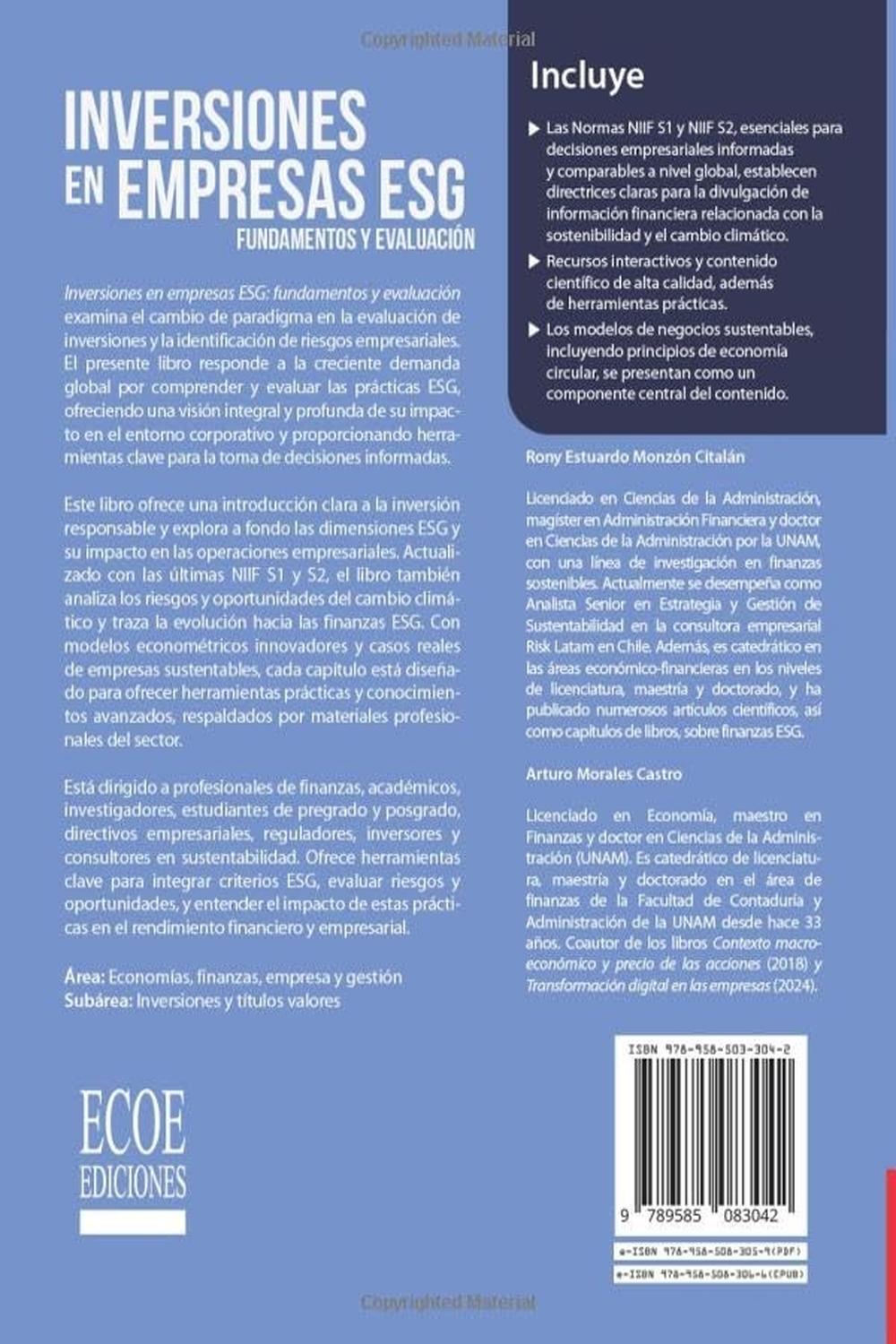Descripción: Inversiones en empresas ESG: fundamentos y evaluación examina el cambio de paradigma en la evaluación de inversiones y la identificación de riesgos empresariales. El presente libro responde a la creciente demanda global por comprender y evaluar las prácticas ESG, ofreciendo una visión integral y profunda de su impacto en el entorno corporativo y proporcionando herramientas