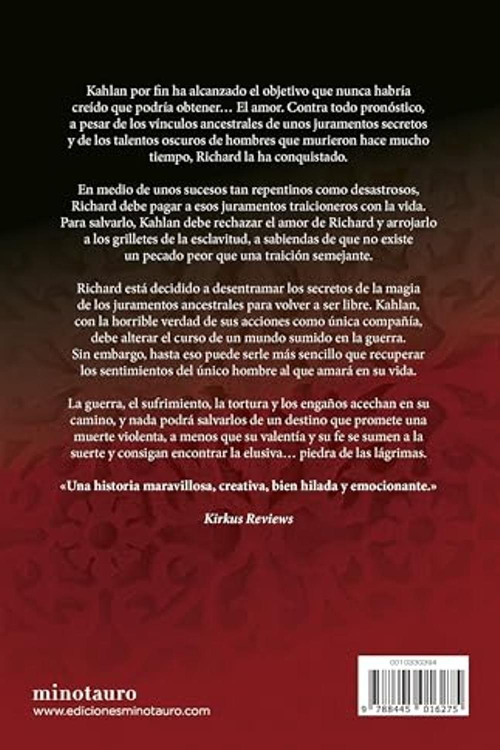 Descripción: No te pierdas esta saga de fantasía épica. Tras derrotar a Rahl el Oscuro, Richard se dispone a disfrutar de la máxima recompensa a la que podría aspirar: el amor de Kahlan. Pero, inadvertidamente, el joven rasgó el velo que separa el mundo de los vivos del de los muertos y ahora debe enfrentarse al mal supremo, al temible Custodio del inframundo, que intenta escapar. Para vencerlo, Richard debe aprender a dominar sus incipientes talentos arcanos, pues de otro modo morirá. A no ser que Richard aprenda a controlar sus poderes, nadie, ni siquiera su amada Kahlan, la poderosa pero benevolente Madre Confesora, podrá salvar al mundo. El único modo de lograrlo es ponerse en manos de las misteriosas Hermanas de la Luz, que afirman ser su única esperanza.