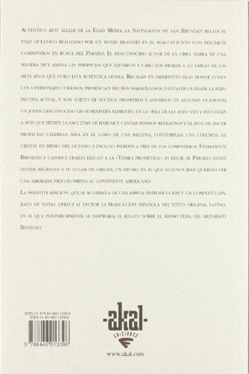 Descripción: Auténtico best seller de la Edad Media, La navegación de san Brendán relata el viaje oceánico realizado por un monje irlandés en el siglo VI junto con diecisiete compañeros en busca del Paraíso. El desconocido autor de la obra narra de una manera muy amena las peripecias que llevaron a cabo los frailes a lo largo de los siete años que duró esta auténtica odisea. Recalan en diferentes islas donde conocen a personajes curiosos, presencian hechos maravillosos y son sujeto de sucesos prósperos y adversos: un joven desconocido les suministra alimento. en la isla de las aves ven y escuchan a aves que tienen la facultad de hablar y cantar himnos religiosos, así como el don de la profecía. celebran misa en el lomo de una ballena. contemplan una columna de cristal en medio del océano, e incluso pierden a tres de los compañeros. Finalmente Brendán y catorce frailes llegan a la tierra prometida, es decir, al Paraíso, desde donde regresan a su lugar de origen, un hecho en el que algunos han querido ver una arribada precolombina al continente americano. La presente edición, que se acompaña de una amplia introducción y un completo aparato de notas, ofrece al lector la traducción al castellano del texto original latino, en el que posteriormente se inspiraría el relato sobre el mismo tema del arzobispo Benedeit.