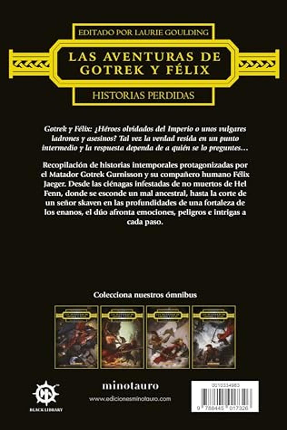 Descripción: Recopilación de historias intemporales protagonizadas por el Matador Gotrek Gurnisson y su compañero humano Félix Jaeger Gotrek y Félix: ¿héroes olvidados del Imperio o vulgares ladrones y asesinos? Puede que la verdad resida en un lugar intermedio y la respuesta dependa de a quién se pregunte… Recopilación de historias intemporales protagonizadas por el Matador Gotrek Gurnisson y su compañero humano Félix Jaeger. Desde las ciénagas infestadas de no muertos de Hel Fenn, donde se esconde un mal ancestral, hasta la corte de un señor skaven en las profundidades de una fortaleza de los enanos, el dúo afronta emociones, peligros e intrigas a cada paso.