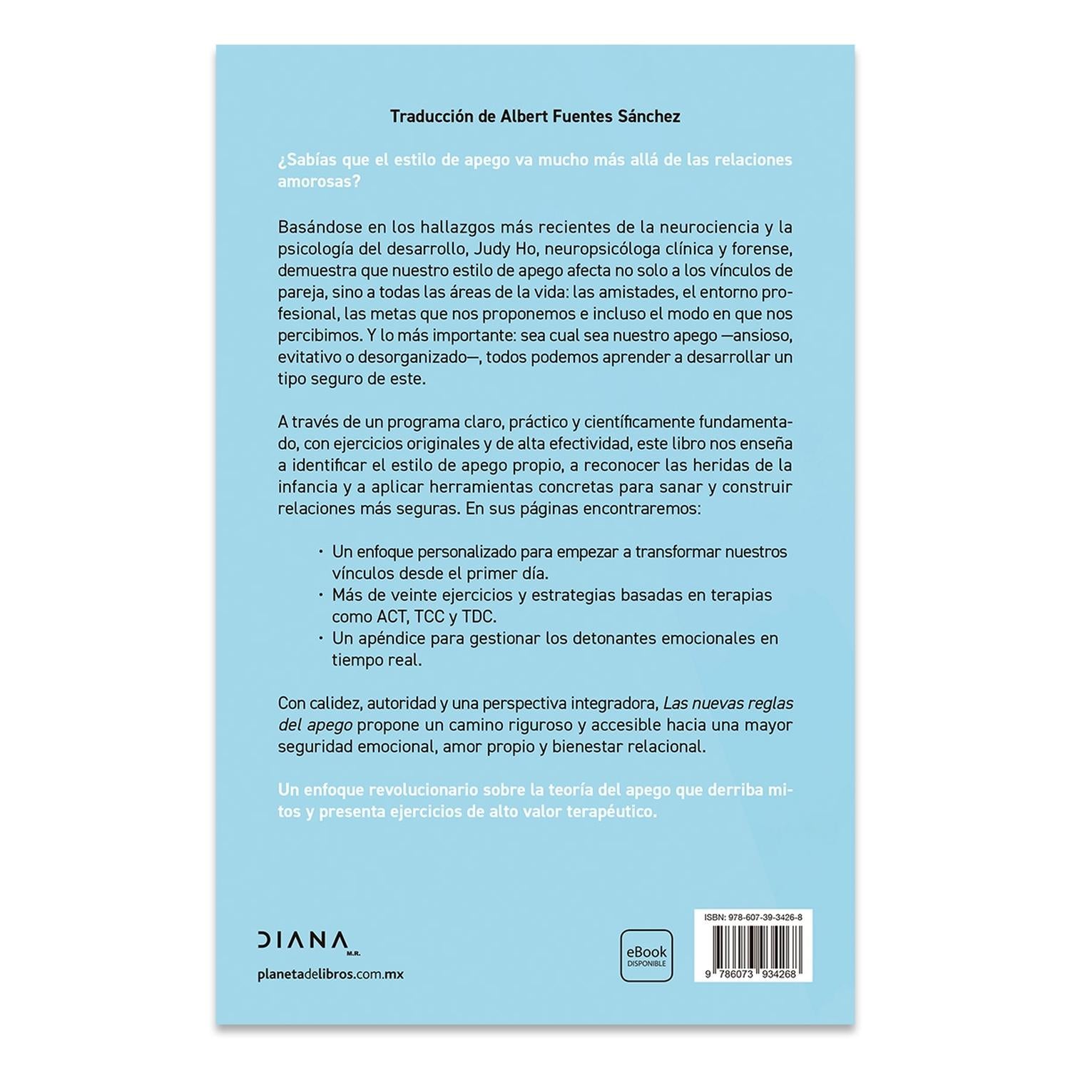 Descripción: Un enfoque revolucionario para transformar tus relaciones y restaurar tu seguridad emocional ¿Qué pasa cuando nuestros patrones de apego nos limitan o nos llevan a relaciones poco saludables? En Las nuevas reglas del apego, la reconocida neuropsicóloga clínica y forense Judy Ho nos ofrece un enfoque revolucionario para comprender y transformar nuestra manera de relacionarnos, permitiéndonos desarrollar un apego más seguro y satisfactorio. Este libro presenta un análisis accesible y riguroso de la teoría del apego, explicando cómo se forman estos patrones en la infancia y cómo continúan influyendo en nuestras relaciones adultas. A través de ejemplos conmovedores y casos de su consulta, Judy Ho muestra cómo los estilos de apego inseguros pueden generar dinámicas problemáticas en la vida personal y profesional, y ofrece herramientas prácticas, basadas en la neurociencia, para repararlos. Con ejercicios transformadores y estrategias innovadoras, esta obra enseña a identificar nuestro estilo de apego, sanar heridas emocionales y fortalecer la autoestima, brindándonos los recursos para construir vínculos más sanos y equilibrados. Además, explora el impacto de nuestros estilos afectivos en la crianza, las relaciones de pareja y el ámbito laboral, integrando el apego en todos los aspectos de la vida. Tanto para psicólogos y terapeutas como para cualquier persona interesada en el autoconocimiento, Las nuevas reglas del apego es una guía esencial para mejorar nuestras relaciones y lograr una mayor seguridad emocional. Con un enfoque empático y práctico, Judy Ho demuestra que, con las herramientas adecuadas, todos podemos transformar nuestra manera de vincularnos y alcanzar una vida más plena y satisfactoria.