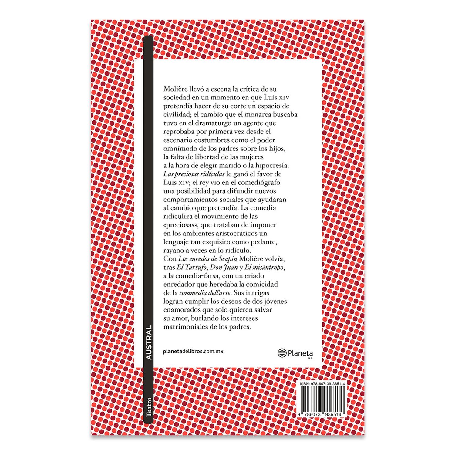 Descripción: Dos obras maestras de uno de los dramaturgos más grandes de la literatura universal. Molière, el mejor comediógrafo francés de todos los tiempos, llevó a escena la crítica de su sociedad en un momento en que Luis XIV pretendía hacer de su corte un espacio de civilidad; el cambio que quería imprimir a su reinado tuvo en el dramaturgo un agente que reprobaba por primera vez desde el escenario costumbres como el poder omnímodo de los padres sobre los hijos, la falta de libertad de las mujeres a la hora de elegir marido o la hipocresía tanto religiosa (El Tartufo) como social (Don Juan). Las preciosas ridículas le ganaron el favor de Luis XIV; el rey vio en el comediógrafo una posibilidad para difundir desde el escenario nuevos comportamientos sociales que ayudaran al cambio que pretendía. La comedia ridiculiza el movimiento de las «preciosas», que trataban de imponer en los ambientes aristocráticos un lenguaje tan exquisito como pedante, rayano a veces en lo ridículo. El éxito fue tan inmediato y rotundo que hizo de Molière en ese momento un «colaborador» de las intenciones reales. Con Los enredos de Scapín el dramaturgo volvía, tras El Tartufo, Don Juan y El misántropo, a la comedia-farsa, con un criado enredador que heredaba la comicidad de la commedia dell’arte. Sus intrigas logran cumplir los deseos de sus «protegidos», dos jóvenes enamorados que solo quieren salvar su amor, burlando los intereses matrimoniales de los padres.