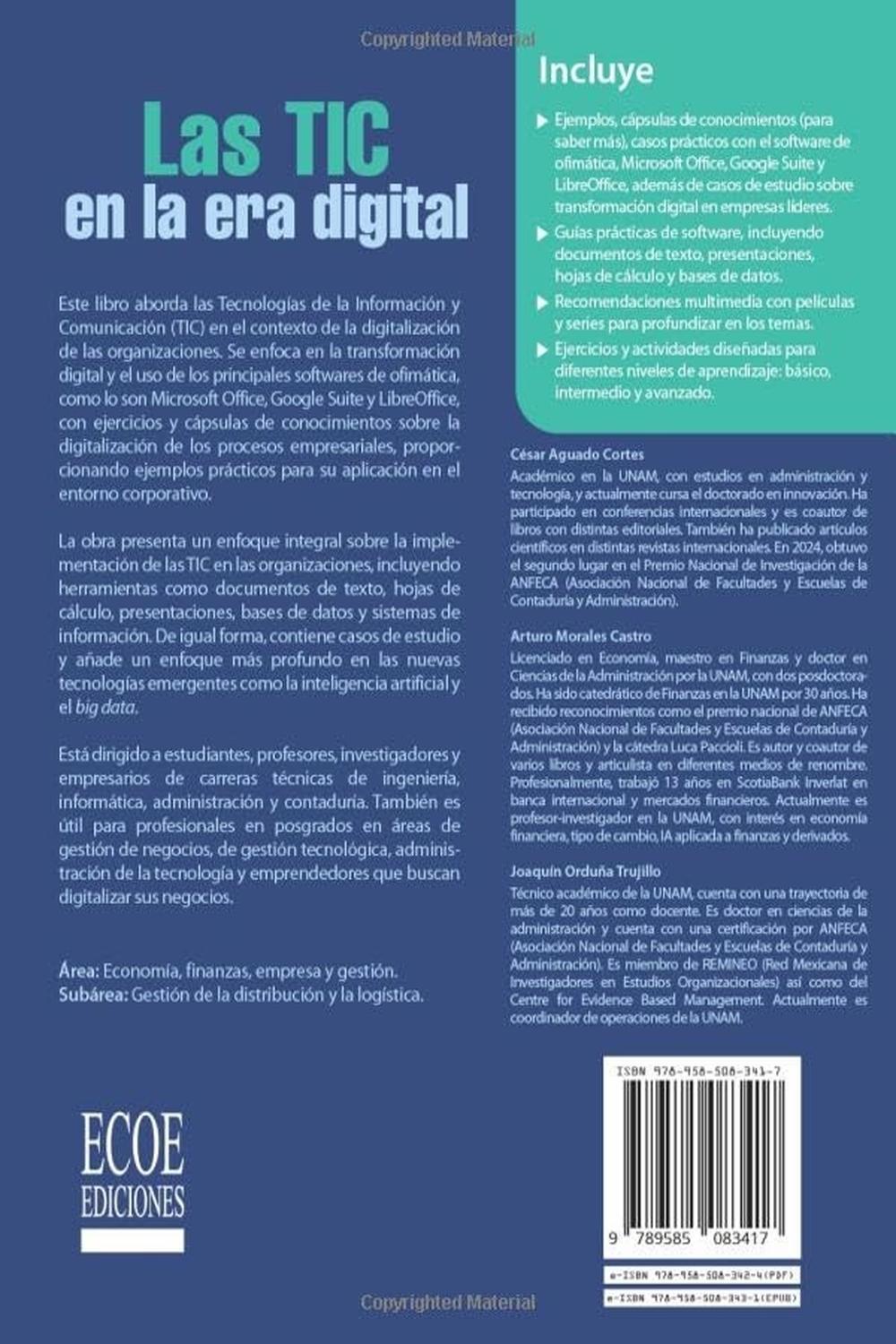 Descripción: Este libro aborda las Tecnologías de la Información y Comunicación (TIC) en el contexto de la digitalización de las organizaciones. Se enfoca en la transformación digital y el uso de los principales softwares de ofimática, como lo son Microsoft Office, Google Suite y LibreOffice, con ejercicios y cápsulas de conocimientos sobre la digitalización de los procesos empresariales, proporcionando ejemplos prácticos para su aplicación en el entorno corporativo.