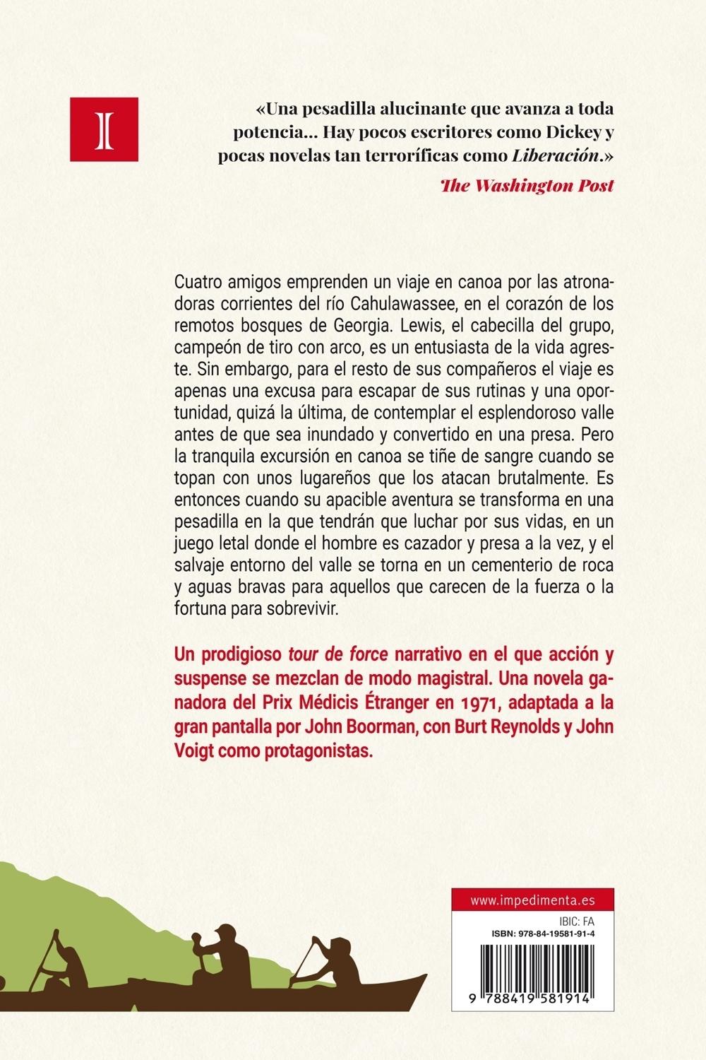 Descripción: Cuatro amigos emprenden un viaje en canoa por las atronadoras corrientes del río Cahulawassee, en el corazón de los remotos bosques de Georgia. Lewis, el cabecilla del grupo, campeón de tiro con arco, es un entusiasta de la vida agreste. Sin embargo, para el resto de sus compañeros el viaje es apenas una excusa para escapar de sus rutinas y una oportunidad, quizá la última, de contemplar el esplendoroso valle antes de que sea inundado y convertido en una presa. Pero la tranquila excursión en canoa se tiñe de sangre cuando se topan con unos lugareños que los atacan brutalmente. Es entonces cuando su apacible aventura se transforma en una pesadilla en la que tendrán que luchar por sus propias vidas, en un juego letal donde el hombre es cazador y presa a la vez, y el salvaje entorno del valle se torna en un cementerio de roca y aguas bravas para aquellos que carecen de la fuerza o la fortuna para sobrevivir.