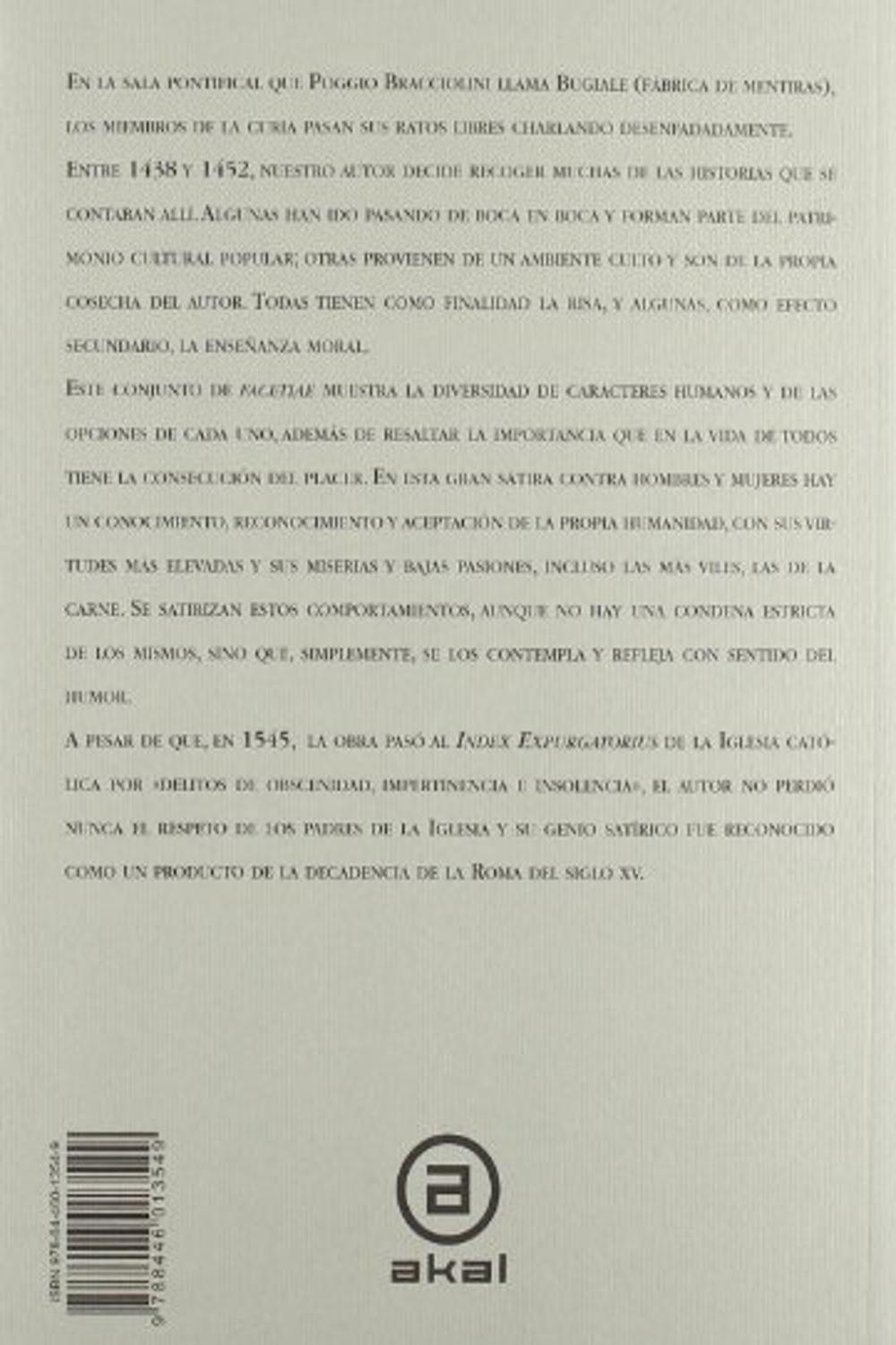 Descripción: En la sala pontificial que Poggio Bracciolini llama Bugiale (fábrica de mentiras), los miembros de la curia pasan sus ratos libres charlando desenfadadamente. Entre 1438 y 1452, el propio Poggio decide recoger muchas de las historias que se contaban allí. Algunas han ido pasando de boca en boca y forman parte del patrimonio cultural popular. otras provienen de un ambiente culto y son de la propia cosecha del autor. Todas tienen como finalidad la risa, y algunas, como efecto secundario, la enseñanza moral. Este conjunto de facetiae muestra la diversidad de caracteres humanos y de las opciones de cada uno, además de resaltar la importancia que en la vida de todos tiene la consecución del placer. En esta gran sátira contra hombres y mujeres hay un conocimiento, reconocimiento y aceptación de la propia humanidad, con sus virtudes más elevadas y sus miserias y bajas pasiones, incluso las más viles, las de la carne. Se satirizan los comportamientos más humanos, aunque no hay una condena estricta de los mismos, sino que, simplemente, se los contempla y refleja con sentido del humor. A pesar de que, en 1545, la obra pasó al Index Expurgatorius de la Iglesia católica por «delitos de obscenidad, impertinencia e insolencia», el autor no perdió nunca el respeto de los padres de la Iglesia y su genio satírico fue reconocido como un producto de la decadencia de la Roma del siglo XV.
