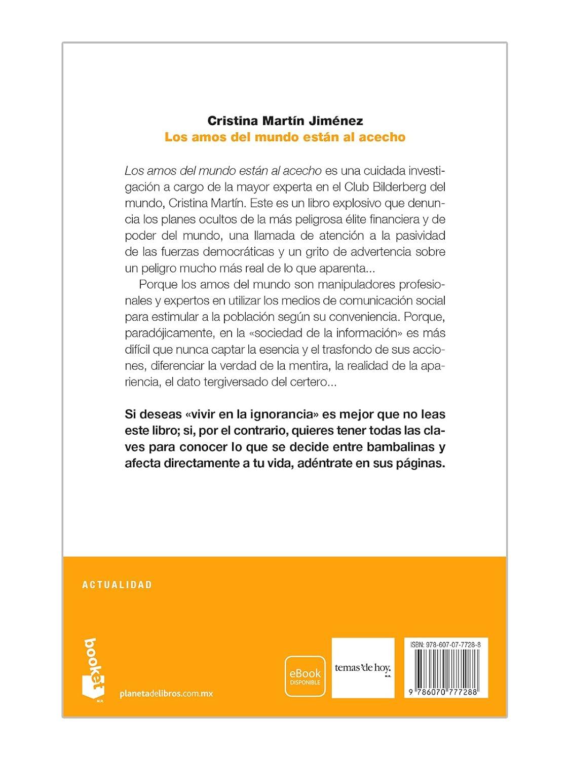 Descripción: En las reuniones secretas de Bilderberg se decide el destino del mundo. Si no tienes el honor de ser invitado, simplemente no existes, no eres nadie. El objetivo del Club es acabar con nuestras libertades personales y manipularnos mediante un único gobierno mundial establecido en la ONU. ¿Cómo es posible que Google, Nokia, Coca-Cola o el FMI puedan cambiar nuestras vidas? En este libro políticamente incorrecto, Cristina Martín Jiménez desvela las últimas mentiras fabricadas por los bilderberges para mantener a la población atemorizada y, como consecuencia, controlada.