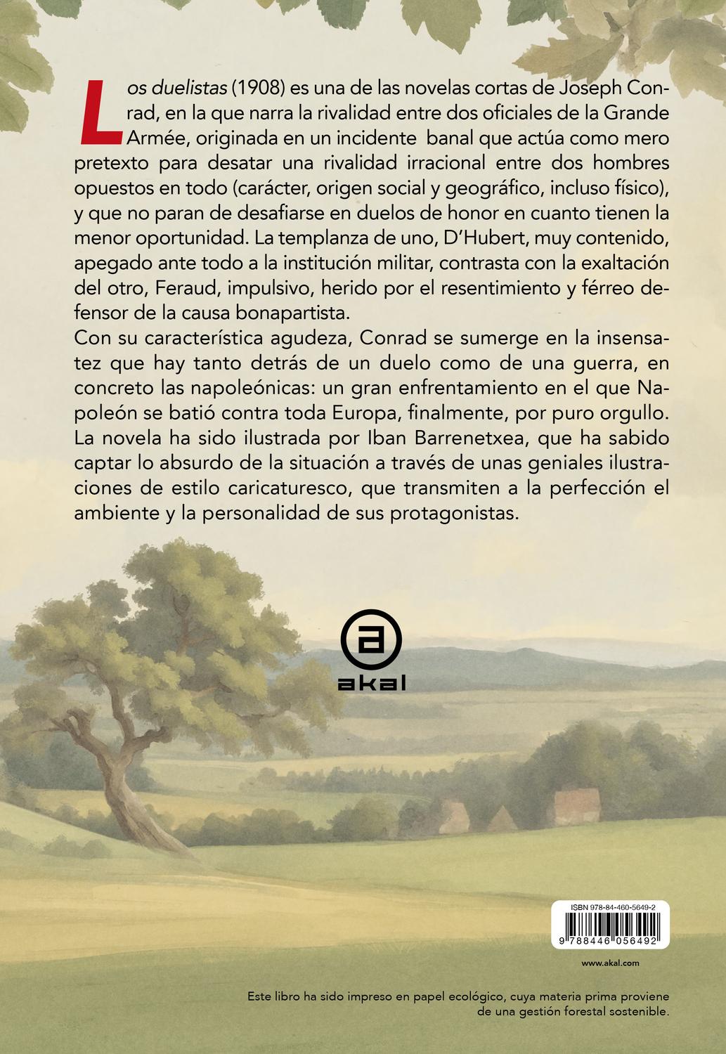 Descripción: Los duelistas (1908) es una de las obras capitales de Joseph Conrad, la historia de una interminable contienda entre dos oficiales de la Grande Armée, enzarzados en una insensata guerra privada, en el marco de las guerras napoleónicas. Cuenta la rivalidad entre dos oficiales napoleónicos durante más de una década, originada en un incidente banal que actúa como mero pretexto para el odio irracional y enquistado entre los dos hombres, opuestos en todo (carácter, origen social y geográfico, incluso físico) y que no paran de desafiarse a duelos de honor en cuanto tienen oportunidad. La templanza de uno, más acomodaticio, apegado ante todo a la institución militar, contrasta con la exaltación del otro, impulsivo, herido por el resentimiento y férreo defensor de la causa bonapartista. Considerada una de sus mejores obras, Conrad, con su característica agudeza, se sumerge en la insensatez que hay tanto tras un duelo como tras una guerra, en especial en las napoleónicas: un gran duelo en el que Napoleón se bate contra toda Europa, finalmente, ya más allá de cualquier razón lógica, por puro orgullo. Una gran novela incluso hoy cuando nos resultan tan distantes estos conceptos que, sin embargo, daban sentido a tantas cosas hace siglos.