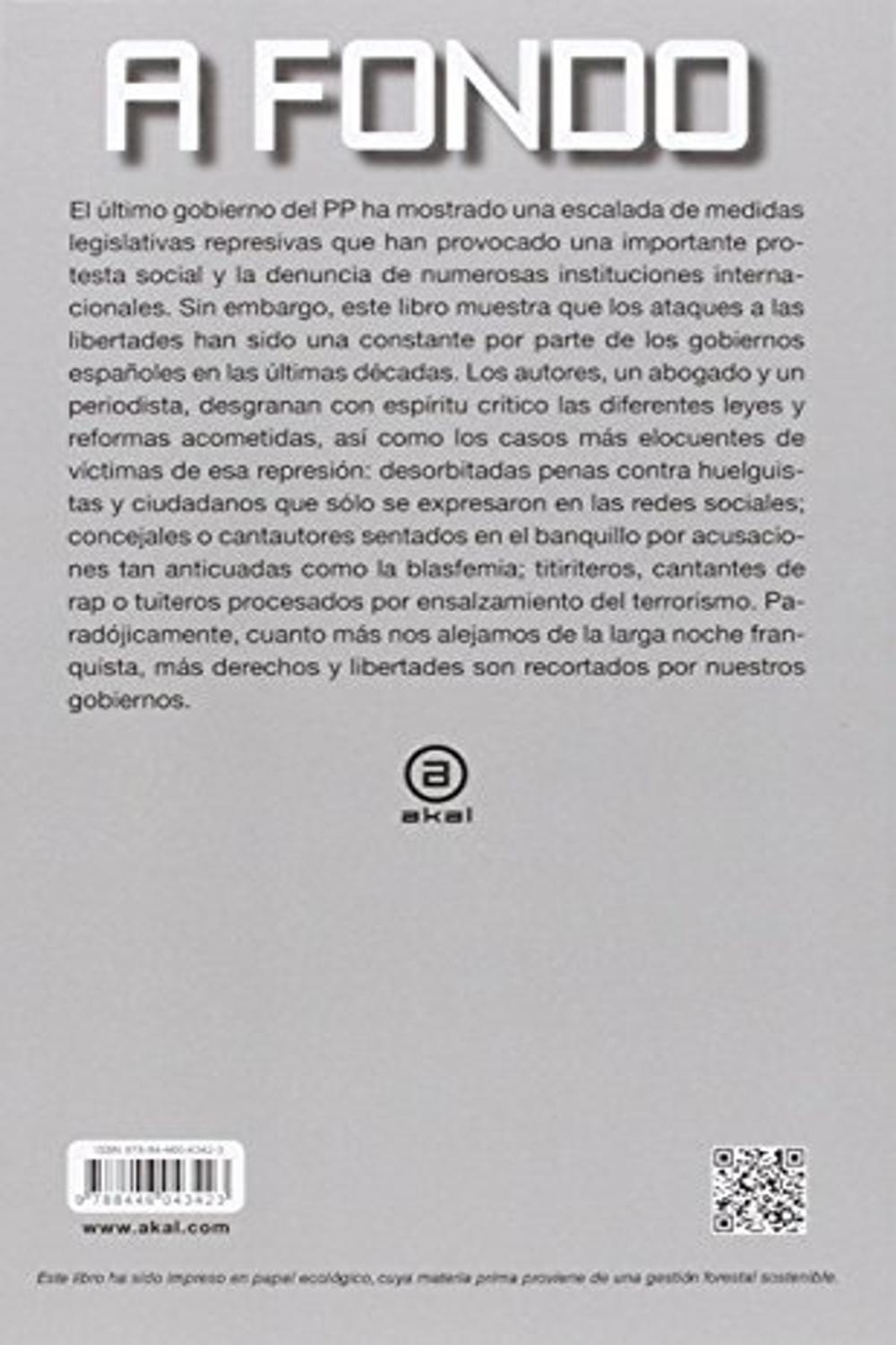 Descripción: El último gobierno del PP ha mostrado una escalada de medidas legislativas represivas que han provocado una importante protesta social. Sin embargo, este libro muestra que los ataques a las libertades han sido una constante por parte de los gobiernos españoles en las últimas décadas. Paradójicamente, cuanto más nos alejamos del periodo franquista, más derechos y libertades son recortados por nuestros gobiernos.