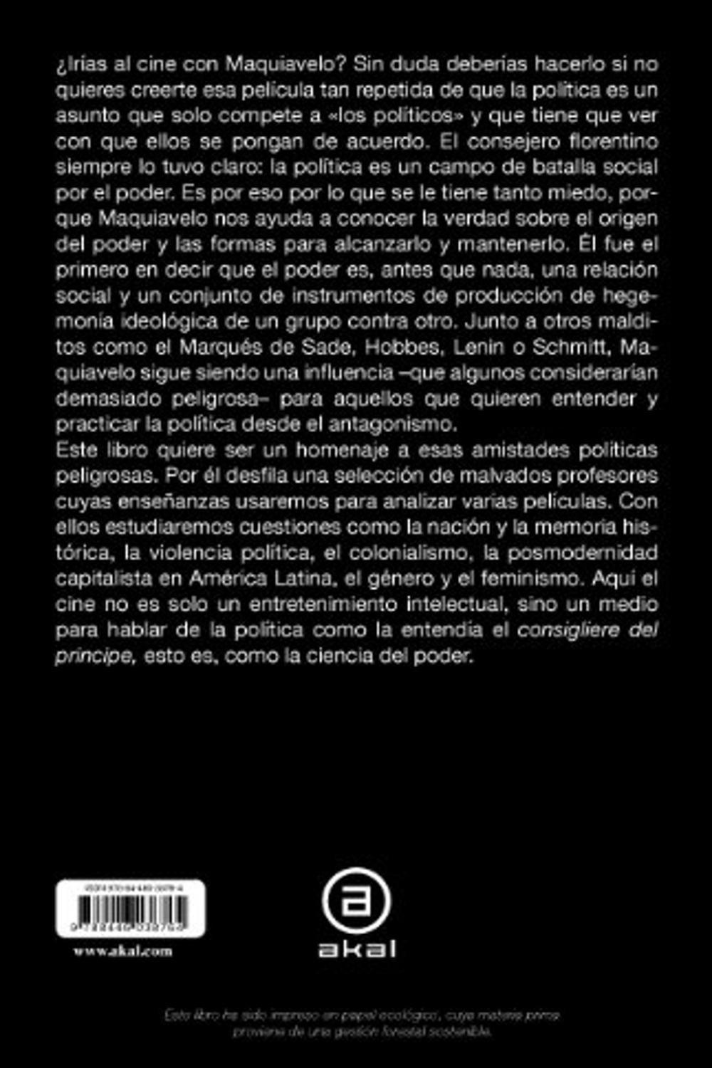 Descripción: ¿Irías al cine con Maquiavelo? Sin duda deberías hacerlo si no quieres creerte esa película tan repetida de que la política es un asunto que solo compete a «los políticos» y que tiene que ver con que ellos se pongan de acuerdo. El consejero florentino siempre lo tuvo claro: la política es un campo de batalla social por el poder. Es por eso por lo que se le tiene tanto miedo, porque Maquiavelo nos ayuda a conocer la verdad sobre el origen del poder y las for-mas para alcanzarlo y mantenerlo. Él fue el primero en decir que el poder es, antes que nada, una relación social y un conjunto de instrumentos de pro-ducción de hegemonía ideológica de un grupo contra otro. Junto a otros malditos como el Marqués de Sade, Hobbes, Lenin o Schmitt, Maquiavelo sigue siendo una influencia –que algunos considerarían demasiado peligrosa– para aquellos que quieren entender y practicar la política desde el antagonismo. Este libro quiere ser un homenaje a esas amistades políticas peligrosas. Por él desfila una selección de malvados profesores cuyas enseñanzas usare-mos para analizar varias películas. Con ellos estudiaremos cuestiones como la nación y la memoria histórica, la violencia política, el colonialismo, la posmodernidad capitalista en América Latina, el género y el feminismo. Aquí el cine no es solo un entretenimiento intelectual, sino un medio para hablar de la política como la entendía el consigliere del principe, esto es, como la ciencia del poder.