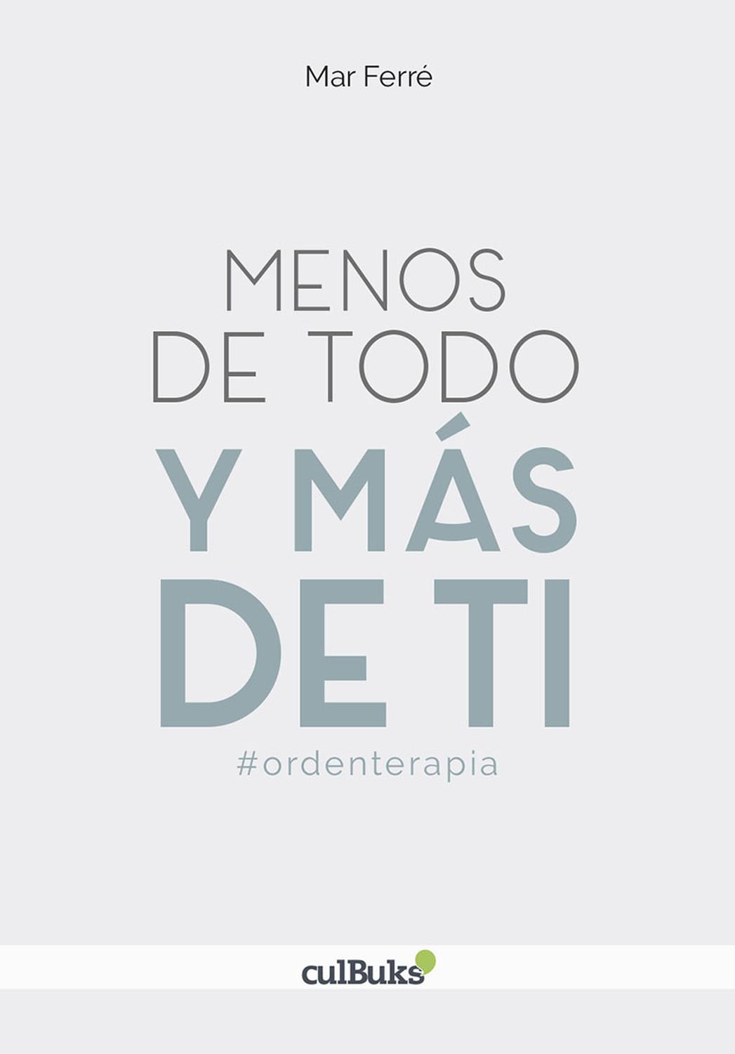 Descripción: Crees que para ser feliz necesitas más cosas, más espacio, más tiempo, más dinero. Caes en el bucle de comprar, tener, hacer, y cuanto más metida estás en esa espiral y más te llenas por fuera, más vacía te sientes por dentro. Y es que olvidaste lo más importante, lo más obvio. Te olvidaste de ser. Te olvidaste de ti.Menos de todo y más de ti es una aventura para volver a ser tú misma. Un camino inspirado en las etapas de un proceso de coaching y basado en la experiencia vital de su autora. Es una guía de viaje por tu casa y tu vida que te llevará a descubrir que organizando conscientemente tu espacio, tu dinero y tu tiempo puedes recuperar tu bienestar interno para vaciarte de cargas y llenarte de ti.En este libro, Mar Ferré ofrece un enfoque más amplio de la organización para que aprendas a utilizarla como herramienta y no como fin. Menos de todo y más de ti es una invitación a descubrir qué hay más allá del orden, porque detrás de un acto tan inocente como ordenar tu armario se esconden infinitas posibilidades que antes no habías contemplado. Ordenar te ofrece la oportunidad de ir más allá, de dialogar contigo misma, de tomar conciencia, de decidir, de elegir y de expresar fuera aquello que llevas dentro. Porque más allá del orden estás tú.