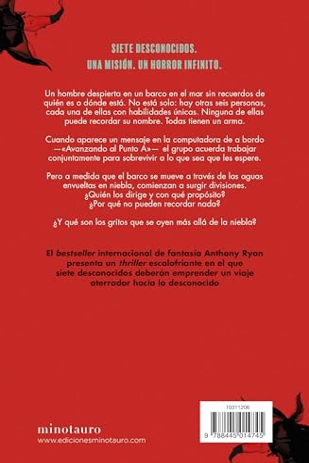 Descripción: Un thriller escalofriante en el que siete desconocidos deberán emprender un viaje aterrador hacia lo desconocido. Siete desconocidos. Una misión. Un horror infinito. Un hombre despierta en un barco en el mar sin recuerdos de quién es o dónde está. No está solo: hay otras seis personas, cada una de ellas con habilidades únicas. Ninguna de ellas puede recordar su nombre. Todas tienen un arma. Cuando aparece un mensaje en la computadora de a bordo — «Avanzando al Punto A» - el grupo acuerda trabajar conjuntamente para sobrevivir a lo que sea que les espere. Pero a medida que el barco se mueve a través de las aguas envueltas en niebla, comienzan a surgir divisiones. ¿Quién los dirige y con qué propósito? ¿Por qué no pueden recordar nada? ¿Y qué son los gritos que se oyen más allá de la niebla?