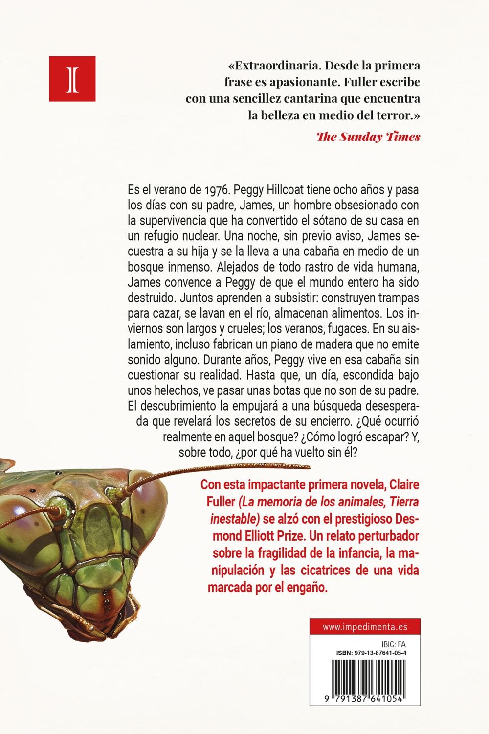Descripción: Un padre. Una hija. Un bosque impenetrable. Una historia de supervivencia extrema, una fábula oscura sobre el amor, la obsesión y el poder destructivo de la mentira. Entre la ternura y el terror, Claire Fuller construye un thriller psicológico inquietante, donde la frontera entre el juego y la realidad se desdibuja hasta volverse insoportable. Es el verano de 1976. Peggy Hillcoat tiene ocho años y pasa los días con su padre, James, un hombre obsesionado con la supervivencia que ha convertido el sótano de su casa en un refugio nuclear. Una noche, sin previo aviso James secuestra a su hija y se la lleva a una cabaña en medio de un bosque inmenso. Alejados de toda señal de vida humana, James convence a Peggy de que el mundo entero ha sido destruido. Juntos aprenden a subsistir: construyen trampas para cazar, se lavan en el río, almacenan alimentos. Los inviernos son largos y crueles; los veranos, fugaces. En su aislamiento, incluso fabrican un piano de madera que no produce sonido alguno.