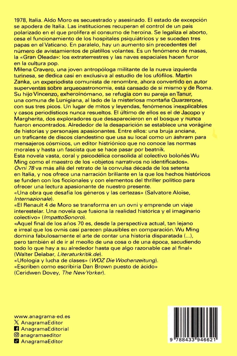 Descripción: 1978, Italia. Aldo Moro es secuestrado y asesinado. El estado de excepción se apodera de Italia. Las instituciones recuperan el control de un país polarizado en el que prolifera el consumo de heroína. Se legaliza el aborto, cesa el funcionamiento de los hospitales psiquiátricos y se suceden tres papas en el Vaticano. En paralelo, hay un aumento sin precedentes del número de avistamientos de platillos volantes. Es un fenómeno de masas, la «Gran Oleada»: los extraterrestres y las naves espaciales hacen furor en la cultura pop. Milena Cravero, una joven antropóloga militante de la nueva izquierda turinesa, se dedica casi en exclusiva al estudio de los ufófilos. Martin Zanka, un experiodista comunista de renombre, ahora convertido en autor superventas sobre arqueoastronomía, está cansado de sí mismo y de Roma. Su hijo Vincenzo, exheroinómano, se refugia con su pareja en Tanur, una comuna de Lunigiana, al lado de la misteriosa montaña Quarzerone, con sus tres picos. Un lugar de mitos y leyendas, fenómenos inexplicables y casos periodísticos nunca resueltos.