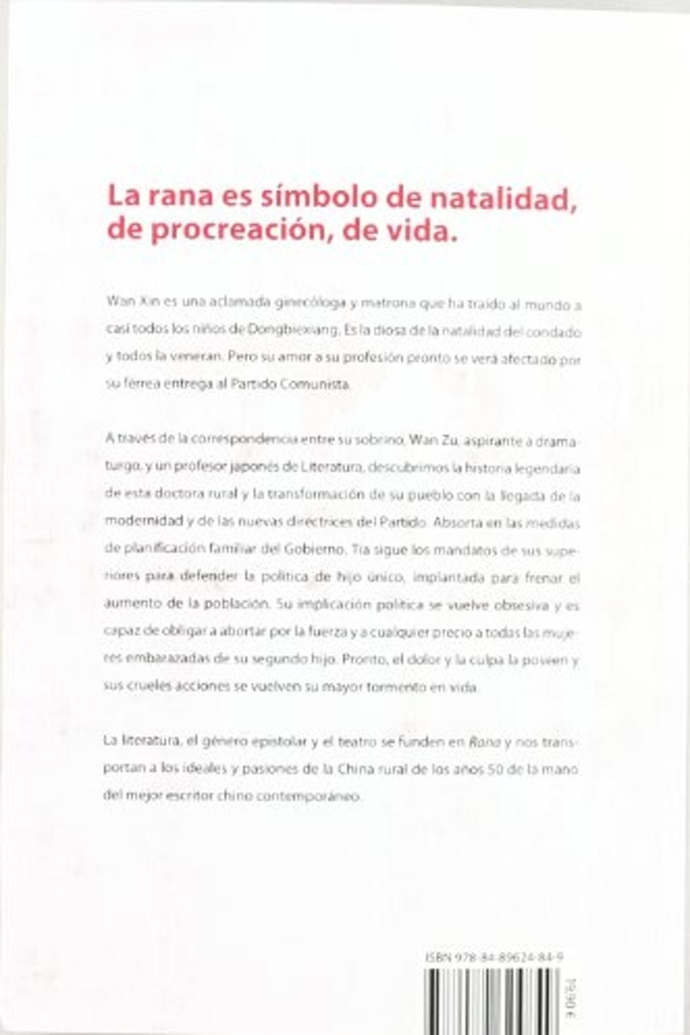 Descripción: Mo Yan, un gran maestro de la literatura universal, mantiene intacta su sorprendente capacidad para desafiar a la clase dirigente de su país sin ser encarcelado ni vejado. La política de planificación familiar en China ha sido durante mucho tiempo un tema que los escritores no se han atrevido a tocar en sus obras literarias. Rana, el título, simboliza la multiplicación de la vida, ya que este anfibio tiene una enorme capacidad para reproducirse. La novela presenta una visión única sobre la vida en la China rural desde la perspectiva de una médico de familia, una vez establecida la política de planificación familiar. El autor nos revela la lucha interna de esta médico entre someterse a las directrices políticas y mantener las bajas tasas de natalidad practicando métodos abortivos a mujeres embarazadas del segundo hijo, o a seguir a su corazón protegiendo a los niños y buscando la prevención de embarazos involuntarios.