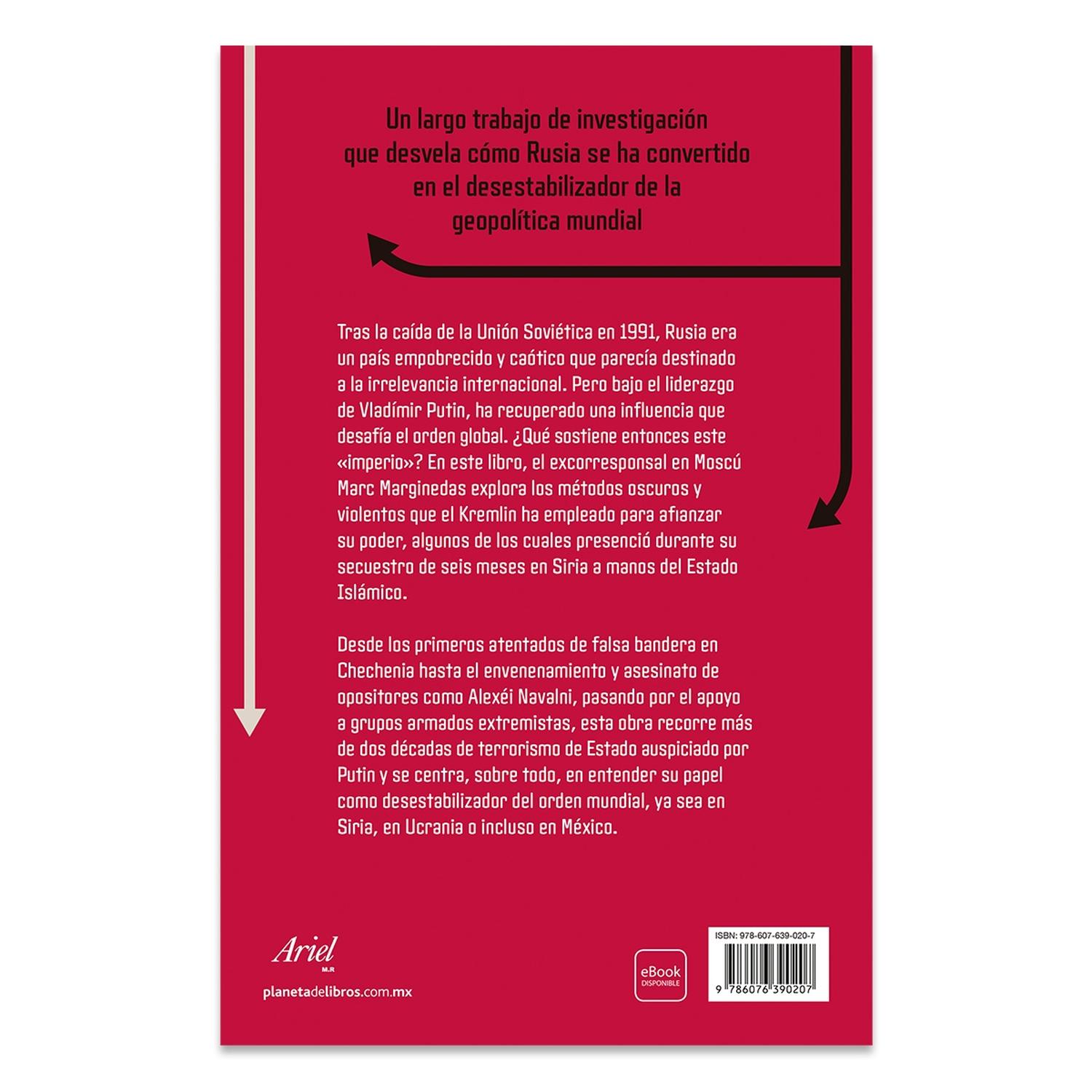 Descripción: Más de dos décadas de terrorismo de Estado, secuestros, mafia y propaganda Tras la caída de la Unión Soviética en 1991, Rusia era un país empobrecido y caótico que parecía destinado a la irrelevancia internacional. Pero bajo el liderazgo de Vladímir Putin, ha recuperado una influencia que desafía el orden global. ¿Qué sostiene este imperio que con los años ha derivado hacia el totalitarismo? En este libro, el antiguo corresponsal de El Periódico en Moscú Marc Marginedas explora los métodos oscuros y violentos que el Kremlin ha empleado para afianzar su poder, algunos de los cuales presenció durante su secuestro de seis meses en Siria a manos de Estado Islámico. Desde los primeros atentados de falsa bandera en Chechenia hasta el envenenamiento y asesinato de opositores como Alexéi Navalni, pasando por la exportación al extranjero de logias mafiosas con vínculos con el Kremlin y el apoyo a grupos armados extremistas, esta obra recorre las más de dos décadas de terrorismo de Estado auspiciado por Putin y se centra sobre todo en entender su papel como desestabilizador del orden mundial, ya sea en Siria, en Ucrania o en la misma España.