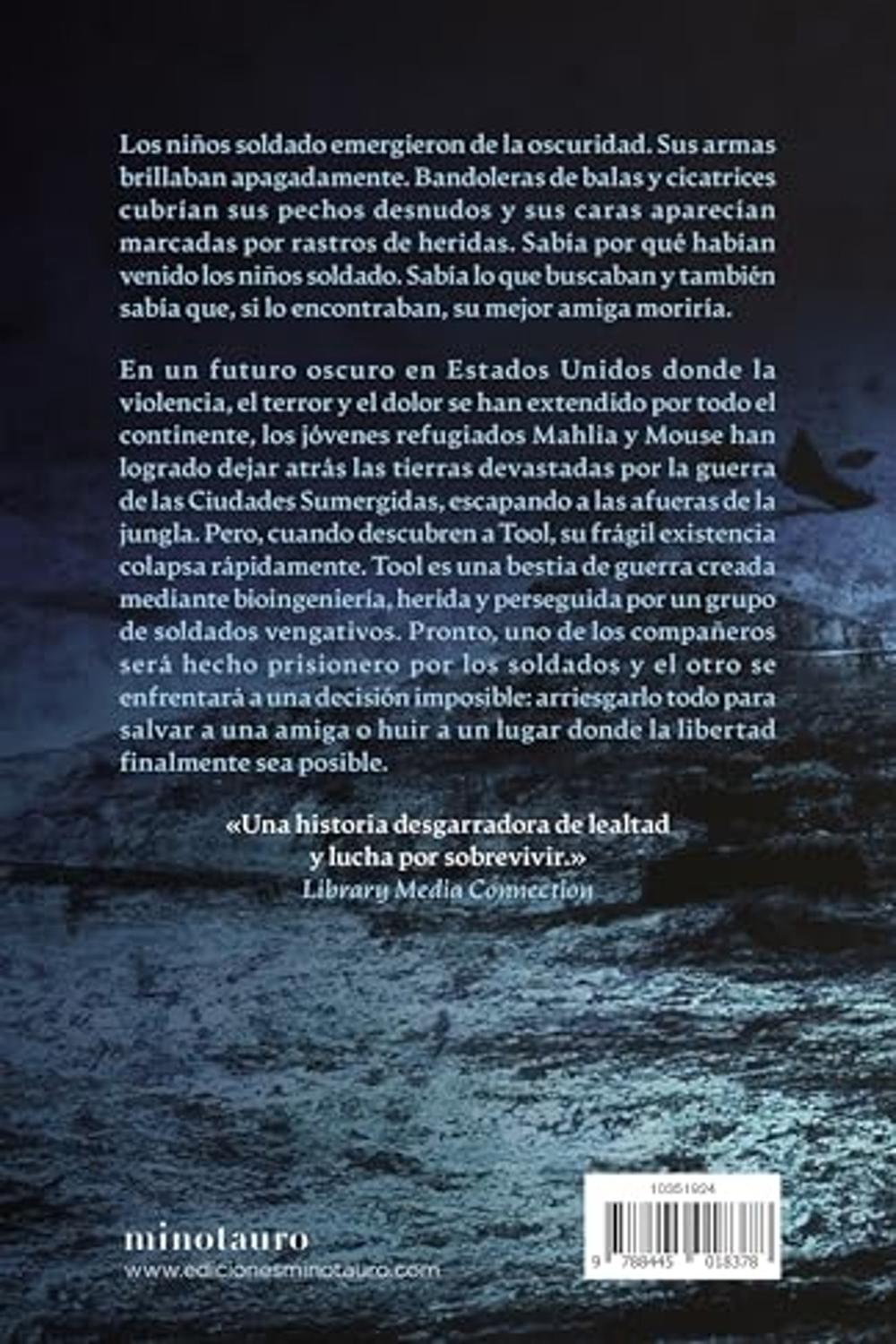 Descripción: Segunda parte de la trilogía de Bacigalupi. Los niños soldado emergieron de la oscuridad. Sus armas brillaban apagadamente. Bandoleras de balas y cicatrices cubrían sus pechos desnudos y sus caras aparecían marcadas por rastros de heridas. Sabía por qué habían venido los niños soldado. Sabía lo que buscaban y también sabía que, si lo encontraban, su mejor amiga moriría. En un futuro oscuro en Estados Unidos donde la violencia, el terror y el dolor se han extendido por todo el continente, los jóvenes refugiados Mahlia y Mouse han logrado dejar atrás las tierras devastadas por la guerra de las Ciudades Sumergidas escapando a las afueras de la jungla. Pero, cuando descubren a Tool, su frágil existencia colapsa rápidamente. Tool es una bestia de guerra creada mediante bioingeniería, ahora herida y perseguida por un grupo de soldados vengativos. Pronto, uno de los compañeros es hecho prisionero por los soldados y el otro se enfrenta a una decisión imposible: arriesgarlo todo para salvar a un amigo o huir a un lugar donde la libertad finalmente sea posible.