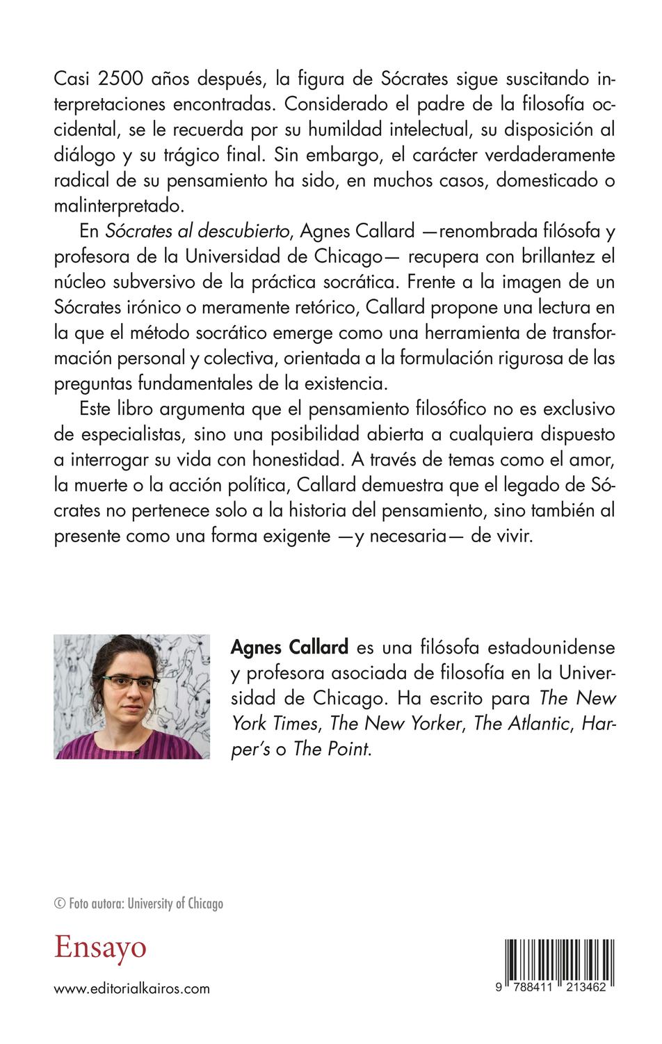 Descripción: El método socrático es un camino de vida para afrontar las incertidumbres modernas. Casi, 2,500 años después, Sócrates continúa desafiándonos a vivir con autenticidad y a formular las preguntas que más importan. La renombrada filósofa Agnes Callard nos invita a redescubrir al Sócrates rebelde y revolucionario, aquel que incomodaba al conformismo de su tiempo. Sócrates al descubierto nos muestra que no solo debemos preguntarnos cómo vivir y cambiar, sino también buscar la ayuda de otros para encarar esas preguntas y las respuestas que de ellas surjan. Callard explica cómo el famoso método socrático, lejos de ser un ejercicio intelectual o académico, es un camino hacia una vida plena, desde el amor, la política o la confrontación con la muerte. A través de estas reflexiones, Callard brinda una nueva ética para enfrentar las incertidumbres modernas.