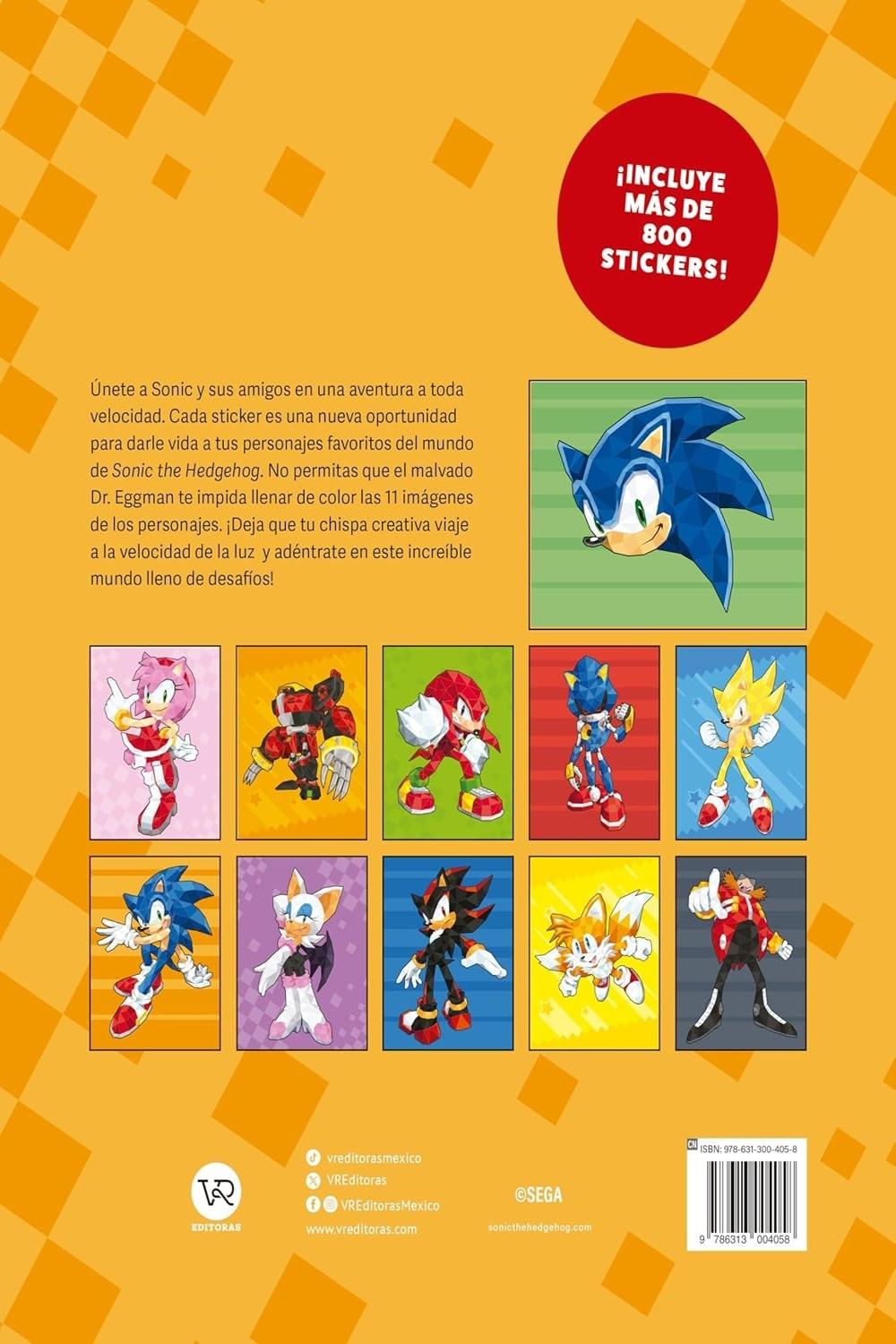 Descripción: ¡Incluye más de 800 stickers! Únete a Sonic y sus amigos en una aventura a toda velocidad. Cada sticker es una nueva oportunidad para darle vida a tus personajes favoritos del mundo de Sonic the Hedgehog. No permitas que el malvado Dr. Eggman te impida llenar de color las 11 imágenes de los personajes. ¡Deja que tu chispa creativa viaje a la velocidad de la luz y adéntrate en este increíble mundo lleno de desafíos!