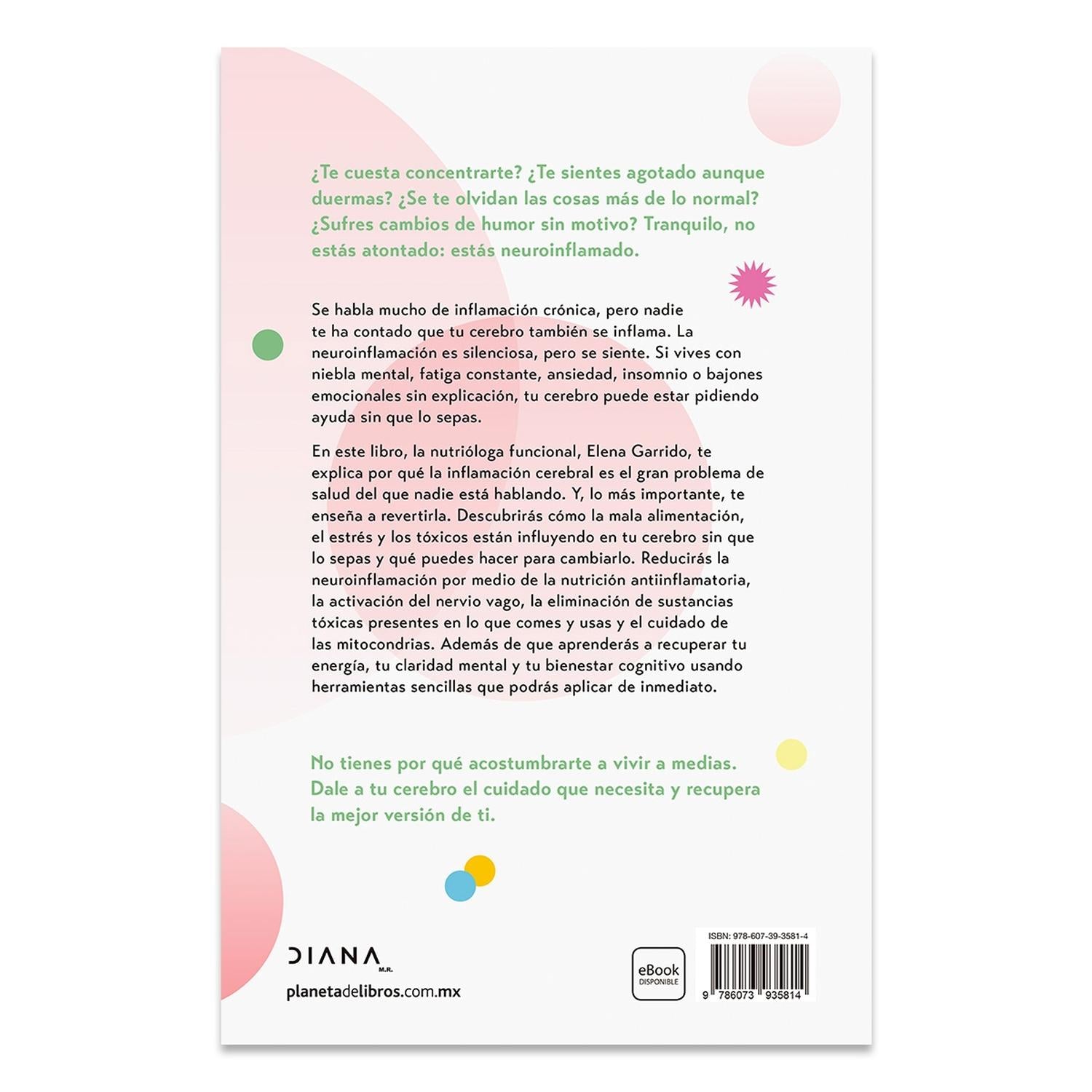 Descripción: Descubre las causas de la neuro inflamación, una afectación silenciosa que está detrás del envejecimiento prematuro del cerebro, y conoce las estrategias prácticas para revertirla. ¿Te cuesta concentrarte? ¿Te sientes agotado, aunque duermas? ¿Se te olvidan las cosas más de lo normal? ¿Sufres cambios de humor sin motivo? Tranquilo, no estás atontado: estás neuroinflamado. Se habla mucho de inflamación crónica, pero nadie te ha contado que tu cerebro también se inflama. La neuro inflamación es silenciosa, no duele, pero se siente: afecta tu memoria, tu estado de ánimo, tu energía y hasta tu forma de ver la vida. Si vives con niebla mental, fatiga constante, ansiedad, insomnio o bajones emocionales sin explicación, tu cerebro puede estar pidiendo ayuda sin que lo sepas. En este libro pionero, Elena Garrido, nutricionista funcional y especialista en PNIE (psiconeuroinmunoendocrinología), te explica por qué la inflamación cerebral es el gran problema de salud del que nadie está hablando. Y, lo más importante, te enseña a revertirla. Descubrirás cómo la mala alimentación, el estrés y los tóxicos están influyendo en tu cerebro sin que lo sepas y qué puedes hacer para cambiarlo. Reducirás la neuroinflamación por medio de la nutrición antiinflamatoria, la activación del nervio vago, la eliminación de tóxicos y el cuidado de las mitocondrias. Y aprenderás a recuperar tu energía, tu claridad mental y tu bienestar cognitivo usando herramientas sencillas que podrás aplicar desde hoy mismo. No tienes por qué acostumbrarte a vivir a medias. Dale a tu cerebro el cuidado que necesita y recupera la mejor versión de ti.