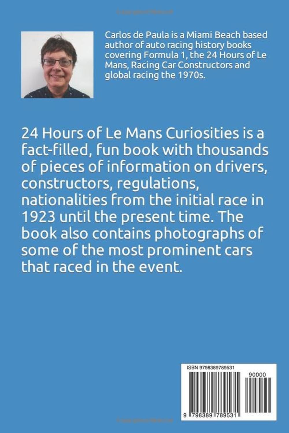 Miles de piezas de información curiosa sobre conductores, constructores, diseño, estadísticas, categorías, hitos, nacionalidades, regulaciones, se proporcionan en este divertido libro, establecido en orden cronológico desde la carrera inicial, en 1923, hasta la actualidad. El libro está ilustrado con fotografías de algunos de los autos más representativos que corrieron en el evento. Está escrito en inglés fácil de leer, por lo que puede ser entendido incluso por personas que no hablan inglés con fluidez. Todos los jugadores y muchos conductores y constructores oscuros están presentados: Ferrari, Jaguar, Bentley, Toyota, Audi, Matra-Simca, Porsche, Ford, Aston Martin, Peugeot, Alfa Romeo, Bugatti, Chenard et Walcker, Lorraine Dietrich, Mazda, Mercedes Benz, BMW, Rondeau, Gordini, Jacky Ickx, Tom Kristensen, Phil Hill, Woolf. Barnato, Derek Bell, Bob Wollek, Yannick Dalmas, Frank Biela, Sebastien Buemi, Bruce McLaren, Chris Amon, A.J. Foyt, Dan Gurney, Olivier Gendebien, Emanuele Pirro, Luigi Chinetti, Raymond Sommer, Tazio Nuvolari, Jean-Pierre Wimile, Hans Stuck, Hurley Haywood, Andre Lotterer, Gerard Larrousse, Graham Hill, Maurice Trintignant, Mike Hawthorn, Stirling Moss, etc.