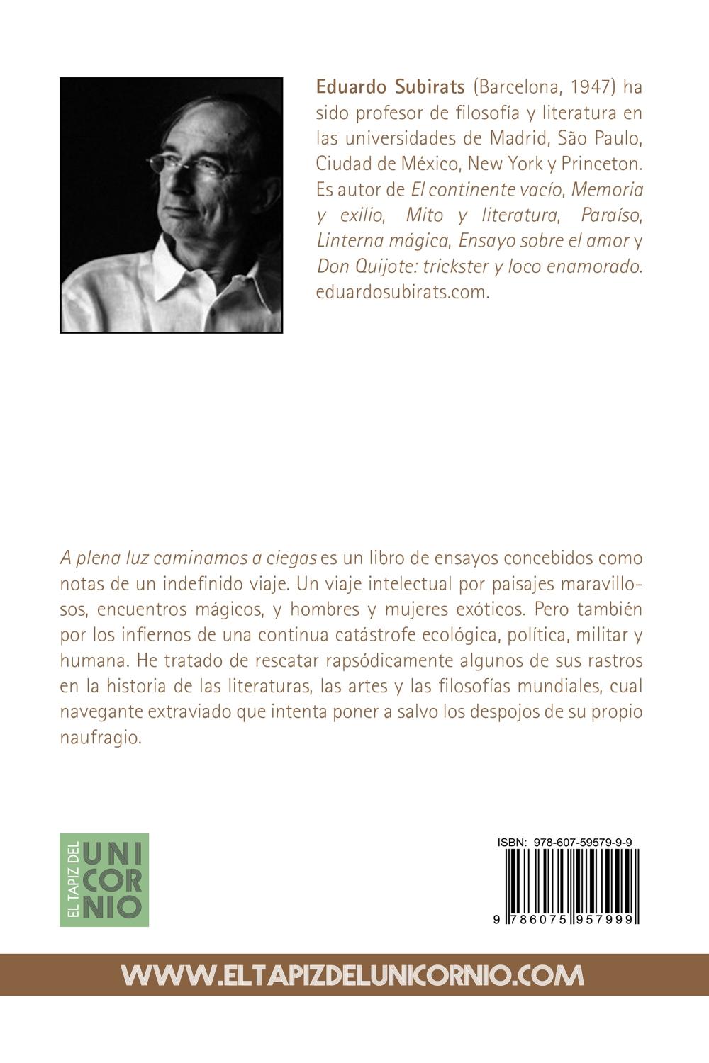 Descripción: A plena luz caminamos a ciegas es un libro de ensayos concebido como una serie de notas surgidas a lo largo de un viaje indefinido. Se trata de un recorrido intelectual por paisajes maravillosos, encuentros mágicos y figuras humanas tan exóticas como singulares; pero también una travesía por los infiernos de una catástrofe continua —ecológica, política, militar y humana— que atraviesa nuestro tiempo. He intentado rescatar, de forma rapsódica, algunos de sus vestigios en la historia de las literaturas, las artes y las filosofías del mundo, como un navegante extraviado que busca poner a salvo los despojos de su propio naufragio.