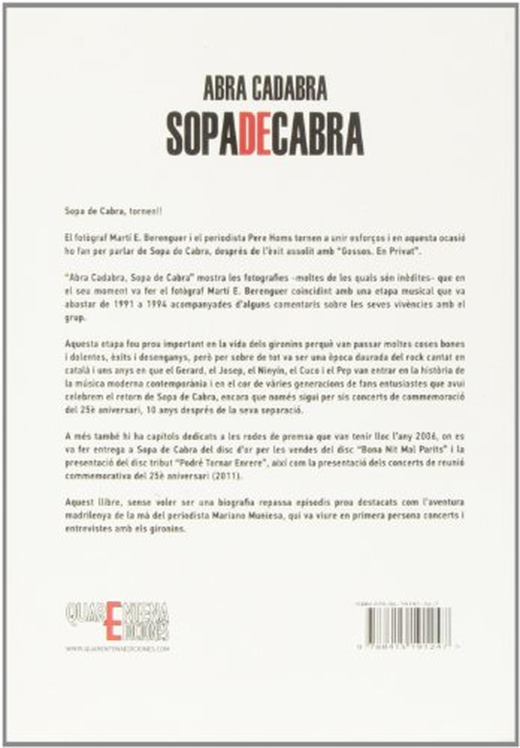 "Abra Cadabra, Sopa de Cabra"mostra les fotografies (moltes de les qua ls són inèdites) que en el seu moment va fer el fotògraf Martí E. Bere nguer coincidint amb una etapa musical que va abastar de 1991 a 1994. Un moment prou important en la vida dels gironins perquè van passar mo ltes coses bones i dolentes, èxits i desenganys, però per sobre de tot va ser una època daurada del rock cantat en català i uns anys en que el Gerard, el Josep, el Ninyín, el Cuco i el Pep van entrar en la hist òria de la música moderna contemporània i en el cor de vàries generaci ons de fans entusiastes que avui celebrem el retorn de Sopa de Cabra, encara que només sigui per quatre concerts de commemoració del 25è ani versari, 10 anys després de la seva separació. Tres concerts al Palau Sant Jordi de Barcelona i un al pavelló Fontajau de Girona en el marc del festival Temporada Alta, la ciutat que els va veure néixer i créix er fins a fer-se famosos.