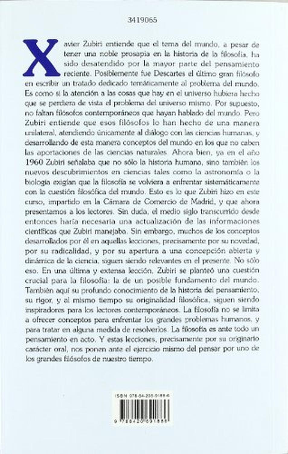 Xavier Zubiri entiende que el tema del mundo, a pesar de tener una noble prosapia en la historia de la filosofía, ha sido desatendido por la mayor parte del pensamiento reciente. Posiblemente fue Descartes el último gran filósofo en escribir un tratado dedicado temáticamente al problema del mundo. Es como si la atención a las cosas que hay en el universo hubiera hecho que se perdiera de vista el problema del universo mismo. Por supuesto, no faltan filósofos contemporáneos que hayan hablado del mundo. Pero Zubiri entiende que esos filósofos lo han hecho de una manera unilateral, atendiendo únicamente al diálogo con las ciencias humanas, y desarrollando de esta manera conceptos del mundo en los que no caben las aportaciones de las ciencias naturales. Ahora bien, ya en el año 1960 Zubiri señalaba que no sólo la historia humana, sino también los nuevos descubrimientos en ciencias tales como la astronomía o la biología exigían que la filosofía se volviera a enfrentar sistemáticamente con la cuestión filosófica del mundo. Esto es lo que Zubiri hizo en este curso, impartido en la Cámara de Comercio de Madrid, y que ahora presentamos a los lectores. Sin duda, el medio siglo transcurrido desde entonces haría necesaria una actualización de las informaciones científicas que Zubiri manejaba. Sin embargo, muchos de los conceptos desarrollados por él en aquellas lecciones, precisamente por su novedad, por su radicalidad, y por su apertura a una concepción abierta y dinámica de la ciencia, siguen siendo relevantes en el presente. No sólo eso. En una última y extensa lección Zubiri se planteó una cuestión crucial para la filosofía: la de un posible fundamento del mundo. También aquí su profundo conocimiento de la historia del pensamiento, su rigor y al mismo tiempo su originalidad filosófica, siguen siendo inspiradores para los lectores contemporáneos.