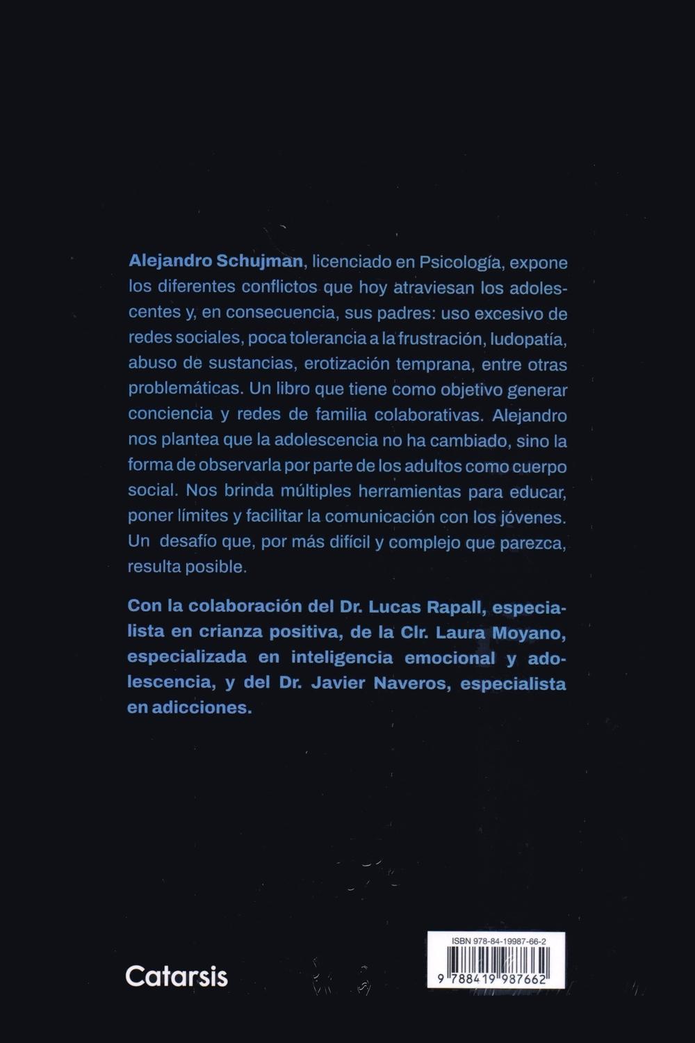 Descripción: Un libro que brinda herramientas para educar, poner límites y facilitar la comunicación con los jóvenes. Un desafío que, por más difícil y complejo que parezca, resulta posible para las familias. Alejandro Schujman, licenciado en Psicología, expone los di