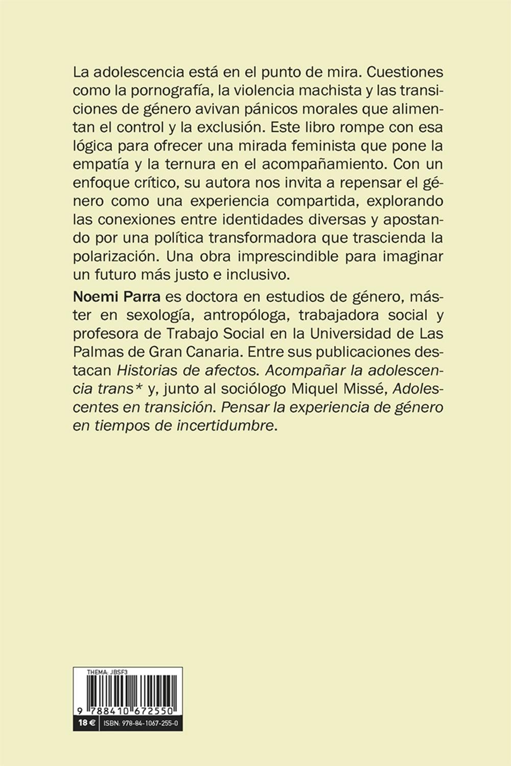 Descripción: Cómo acompañar la adolescencia de las personas trans. La adolescencia está en el punto de mira. Cuestiones como la pornografía, la violencia machista y las transiciones de género avivan pánicos morales que alimentan el control y la exclusión. Este libro rompe con esa lógica para ofrecer una mirada feminista que pone la empatía y la ternura en el acompañamiento. Con un enfoque crítico, su autora nos invita a repensar el género como una experiencia compartida, explorando las conexiones entre identidades diversas y apostando por una política transformadora que trascienda la polarización. Una obra imprescindible para imaginar un futuro más justo e inclusivo. Noemi Parra es doctora en estudios de género, antropóloga y profesora de Trabajo Social en la Universidad de Las Palmas de Gran Canaria. Entre sus publicaciones destacan Historias de afectos. Acompañar la adolescencia trans y, junto al sociólogo Miquel Missé, Adolescentes en transición.