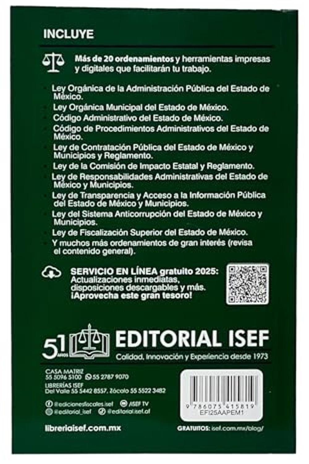 Descripción: Ley Orgánica De La Administración Pública Del Estado De México. Ley Orgánica Municipal Del Estado De México. Código Administrativo Del Estado De México. Reglamento Del Libro Quinto Del Código Administrativo Del Estado De México. Reglamento Del Libro Sexto Del Código Administrativo Del Estado De México. Reglamento Del Libro Décimo Segundo Del Código Administrativo Del Estado De México. Ley De Contratación Pública Del Estado De México Y Municipios. Reglamento De La Ley De Contratación Pública Del Estado De México Y Municipios. Ley De Asociaciones Público Privadas Del Estado De México Y Municipios. Reglamento De La Ley De Asociaciones Público Privadas Del Estado De México Y Municipios. Código De Procedimientos Administrativos Del Estado De México. Ley Para La Inclusión De Las Personas Con Discapacidad Del Estado De México. Ley De Responsabilidades Administrativas Del Estado De México Y Municipios. Ley De Transparencia Y Acceso A La Información Pública Del Estado De México Y Municipios. Ley Del Sistema Anticorrupción Del Estado De México Y Municipios. Ley De Fiscalización Superior Del Estado De México. Ley De Bienes Del Estado De México Y De Sus Municipios. Ley De Desarrollo Social Del Estado De México. Ley Del Trabajo De Los Servidores Públicos Del Estado Y Municipios. Ley De Seguridad Social Para Los Servidores Públicos Del Estado De México Y Municipios. Reglamento De Profesionalización Para Las Personas Servidoras Públicas Del Poder Ejecutivo Del Estado De México. Ley De Gobierno Digital Del Estado De México Y Municipios. Reglamento De La Ley De Gobierno Digital Del Estado De México Y Municipios. Ley De La Comisión De Impacto Estatal Y Reglamento.