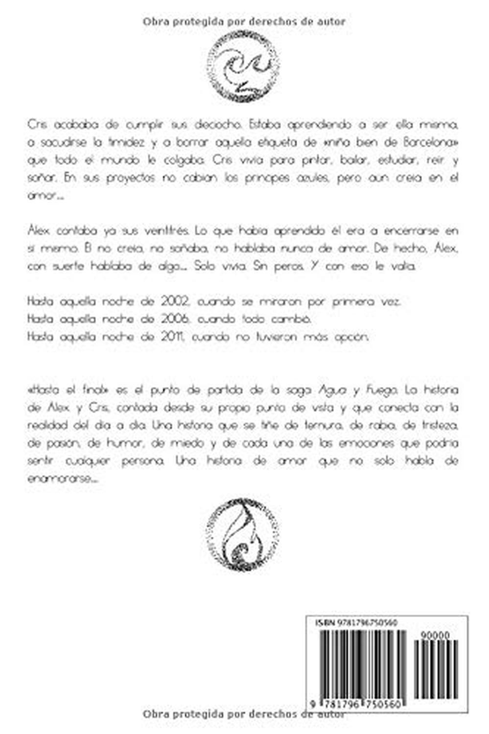 «Hasta el final» es el punto de partida de la saga Agua y Fuego. La historia de Álex y Cris, contada desde su propio punto de vista y que conecta con la realidad del día a día. Una historia que se tiñe de ternura, de rabia, de tristeza, de pasión, de humor, de miedo y de cada una de las emociones que podría sentir cualquier persona. Una historia de amor que no solo habla de enamorarse...