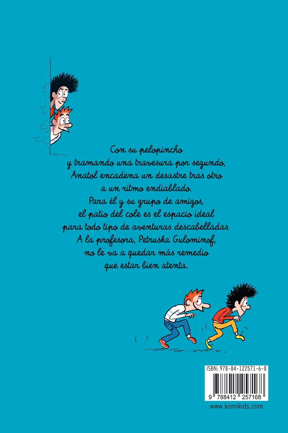 Descripción: Anatol Lapifia es un colegial desmelenado, tan inteligente como travieso, que dedica cada minuto del día a un solo objetivo: ¡meterse en líos! Con su pelo en punta, sus ideas alocadas y una creatividad que nunca descansa, Anatol transforma el patio del cole en el escenario de las aventuras más disparatadas. Junto a su pandilla de amigos, las bromas, las carreras y los experimentos locos están asegurados. La pobre profesora Petruska Gulominof tendrá que armarse de paciencia y reflejos si no quiere ser la víctima de la próxima travesura. Un personaje querido por miles de lectores, Anatol lleva años haciendo reír en las páginas de las revistas Leoleo y Tiroliro, y ahora sus mejores ocurrencias están reunidas en formato libro. ¡Prepárate para carcajadas, caos y mucha diversión!