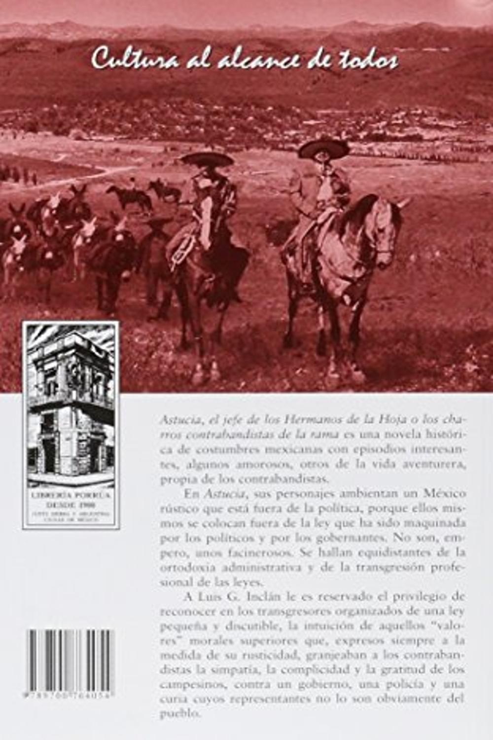 Descripción: Astucia, junto con Los bandidos de Río Frío, está considerada como la obra maestra de la naciente novelística mexicana. Ubicada en los primeros años del México independiente, esta novela cuenta la historia de Lorenzo Cabello, traficante de aguardiente que tras perder sus bienes a causa de una traición decide unirse a un grupo de contrabandistas de tabaco, los Hermanos de la Hoja, con quienes vive una serie de aventuras a la vez que se convierte en su líder. Para el autor, los protagonistas —habitantes del medio rural— trascienden los simples delincuentes y se convierten en portadores de aquellos “valores” morales superiores que traen consigo la simpatía, la complicidad y la gratitud de los campesinos, frente a un gobierno y una policía ajenos al pueblo.