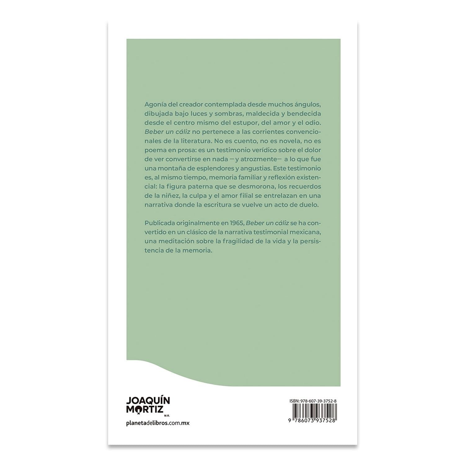 Descripción: Publicada originalmente en 1965, Beber un cáliz, de Ricardo Garibay, se ha convertido en un clásico de la narrativa testimonial mexicana, una meditación sobre la fragilidad de la vida y la persistencia de la memoria. Agonía del creador contemplada desde muchos ángulos, dibujada bajo muchas luces y sombras, maldecida y bendecida desde el centro mismo del estupor, del amor y el odio de la criatura. Beber un cáliz no pertenece a las corrientes convencionales de la literatura. No es cuento, no es novela, no es poema en prosa: es un testimonio verídico sobre el dolor de ver convertirse atrozmente en nada una antigua montaña de esplendores y angustias. Este testimonio es, al mismo tiempo, memoria familiar y reflexión existencial: la figura paterna que se desmorona, los recuerdos de la niñez, la culpa y el amor filial se entrelazan en un relato donde la escritura se vuelve un acto de duelo.