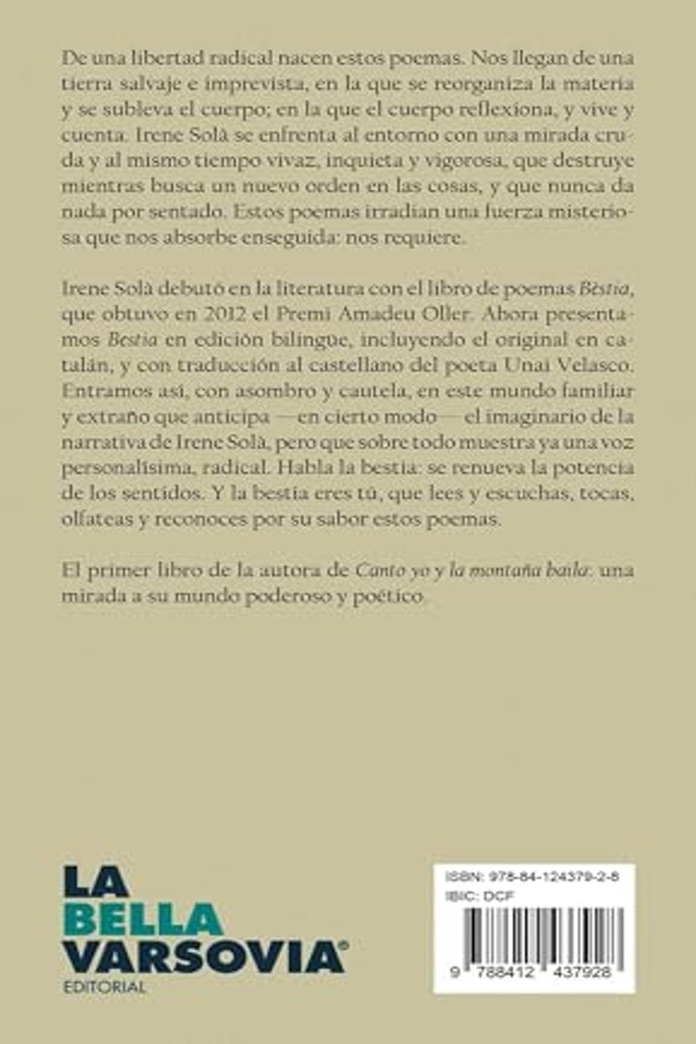 Irene Solà debutó en la literatura con el libro de poemas Bèstia, que obtuvo en 2012 el Premi Amadeu Oller. Ahora presentamos Bestia en edición bilingüe, incluyendo el original en catalán, y con traducción al castellano del poeta Unai Velasco.