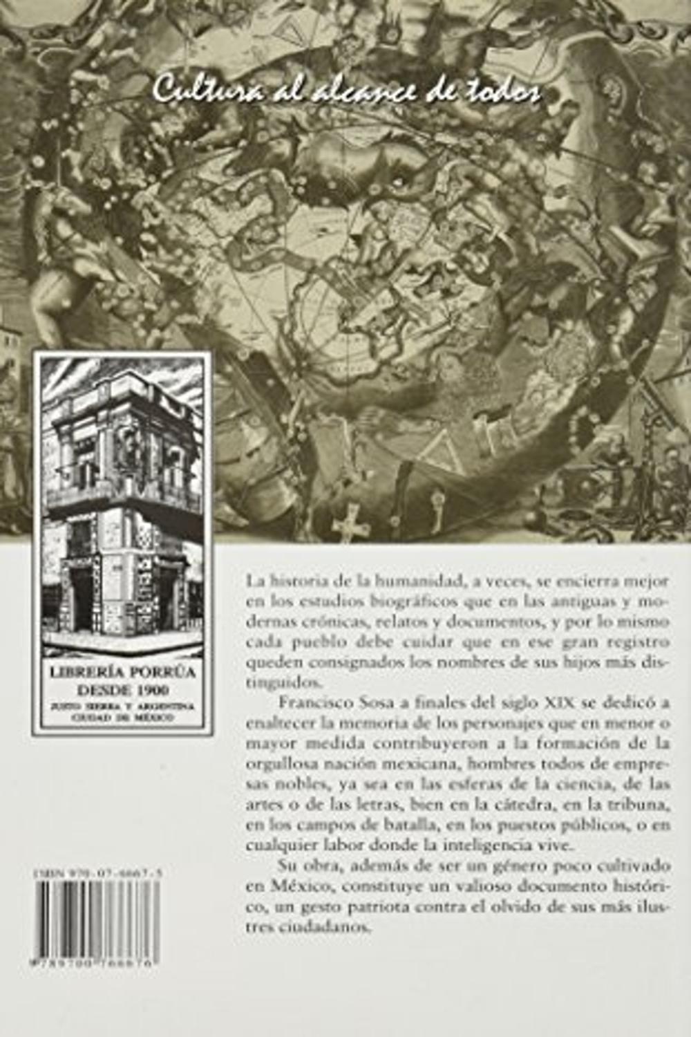 Descripción: La historia de la humanidad, a veces, se encierra mejor en los estudios biográficos que en las antiguas y modernas crónicas, relatos y documentos, y por lo mismo cada pueblo debe cuidar que en ese gran registro queden consignados los nombres de sus hijos más distinguidos. Francisco Sosa a finales del siglo XIX se dedicó a enaltecer la memoria de los personajes que en menor o mayor medida contribuyeron a la formación de la orgullosa nación mexicana, hombres todos de empresas nobles, ya sea en las esferas de la ciencia, de las artes o de las letras, bien en la cátedra, en la tribuna, en los campos de batalla, en los puestos públicos, o en cualquier labor donde la inteligencia vive. Su obra, además de ser un género poco cultivado en México, constituye un valioso documento histórico, un gesto patriota contra el olvido de sus más ilustres ciudadanos.