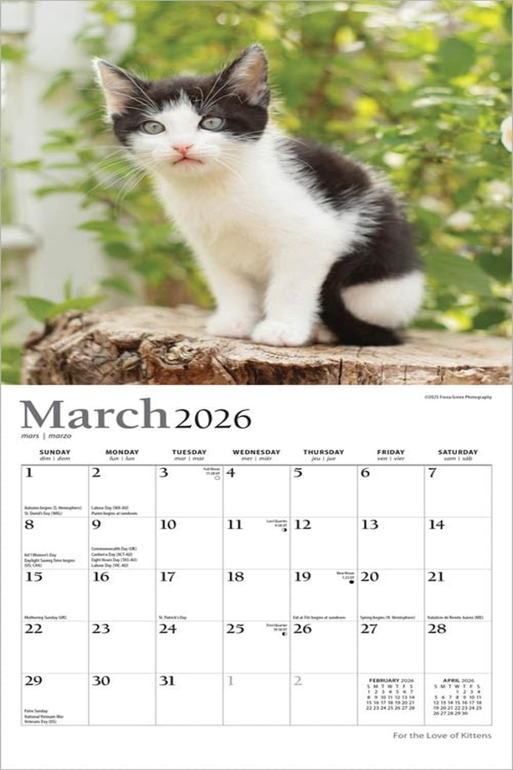 Descripción: El repiqueteo de patitas y una bola de hilo que pasa corriendo... la energía de un gatito parece inagotable. De repente, se detiene, bosteza y se acurruca como una bolita de pelo en tu regazo, en tu pecho o contra tu mejilla. ¡Es perfecto! Estas traviesas e infinitamente adorables criaturas retozan, juegan y duermen la siesta en este irresistible calendario. Este mini calendario de pared de 18 x 18 cm es ideal para llevar fotos y diseños impresionantes a tu hogar u oficina, donde el espacio es limitado. Abierto, su tamaño de 18 x 35 cm es perfecto para espacios pequeños. Con fechas de enero a diciembre, también incluye una página adicional de mini calendario de cuatro meses, de septiembre a diciembre del año anterior, para que puedas empezar a planificar con antelación. Las cuadrículas mensuales te permiten escribir las tareas y citas diarias, e incluyen los principales días festivos de EE. UU. y del mundo. Puedes comprarlo con la tranquilidad de que todos los componentes son reciclables. Fotografía: disfruta de impresionantes fotografías o ilustraciones a todo color cada mes. Construcción duradera: el papel resistente y de alta calidad evita que la tinta se doble y traspase, y la encuadernación duradera garantiza una larga vida útil durante todo el año. Usar de inmediato: el calendario de 16 meses consta de 12 páginas mensuales completas precedidas de una página adicional con los últimos cuatro meses del año anterior. Tamaño compacto: su tamaño pequeño es perfecto para espacios limitados. Bloques de días compactos: incluye todos los días festivos principales y las fases lunares. Especificaciones: diseños mensuales de dos páginas para 16 meses (enero-diciembre de 2026) más una IMAGEN ADICIONAL de cuatro meses que incluye minicuadrículas de septiembre a diciembre de 2025; 18 x 18 cm (cerrado); 18 x 35 cm (abierto); 28 páginas Compromiso ambiental de BrownTrout: Fabricado con materiales sostenibles, como papel certificado por el Forest Stewardship Council® y tinta de soya. Abundantes opciones de regalo: BrownTrout cuenta con más de 1000 calendarios con temas populares en varios formatos para que te mantengas organizado. Enviar comentarios Paneles laterales Historial Guardadas