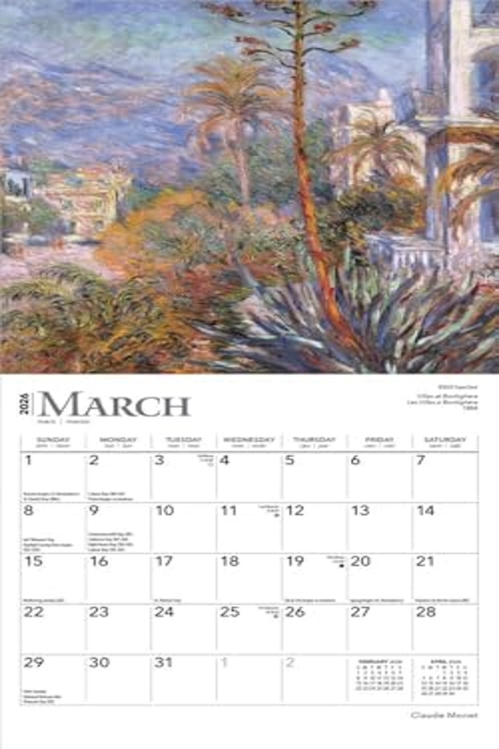 Descripción: Este gran maestro del impresionismo ha influido en artistas y cautivado a las masas durante más de un siglo. Estudiando cuidadosamente cómo la luz natural se reflejaba en sus sujetos, Claude Monet se interesó en capturar cómo aparecía una escena en el instante fugaz. Para ello, aprendió a pintar rápidamente con pinceladas cortas y colores puros y sin mezclar. Aunque a menudo imitado, su obra sigue siendo inigualable. Deléitese con una maravillosa colección de obras maestras de Monet con este magnífico calendario. Este calendario bilingüe incluye meses, días, días festivos y pies de foto en inglés y francés.