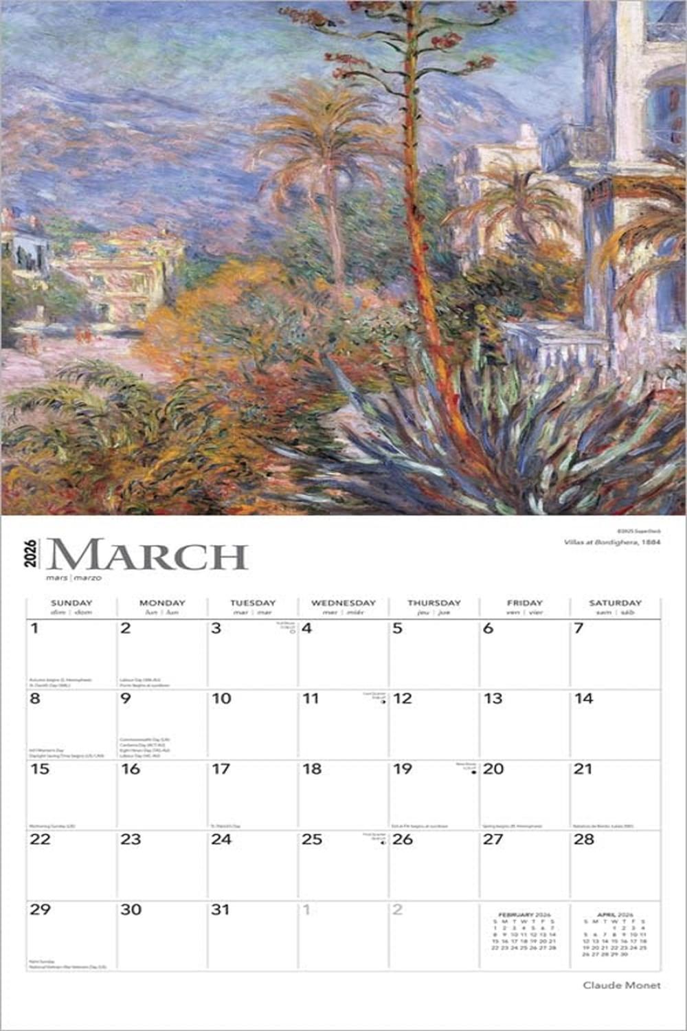 Descripción: Este gran maestro del impresionismo ha influido en artistas y cautivado a las masas durante más de un siglo. Estudiando cuidadosamente cómo la luz natural se reflejaba en sus sujetos, Claude Monet se interesó en capturar cómo aparecía una escena en el instante fugaz. Para ello, aprendió a pintar rápidamente con pinceladas cortas y colores puros y sin mezclar. Aunque a menudo imitado, su obra sigue siendo inigualable. Deléitese con una maravillosa colección de obras maestras de Monet con este magnífico calendario.