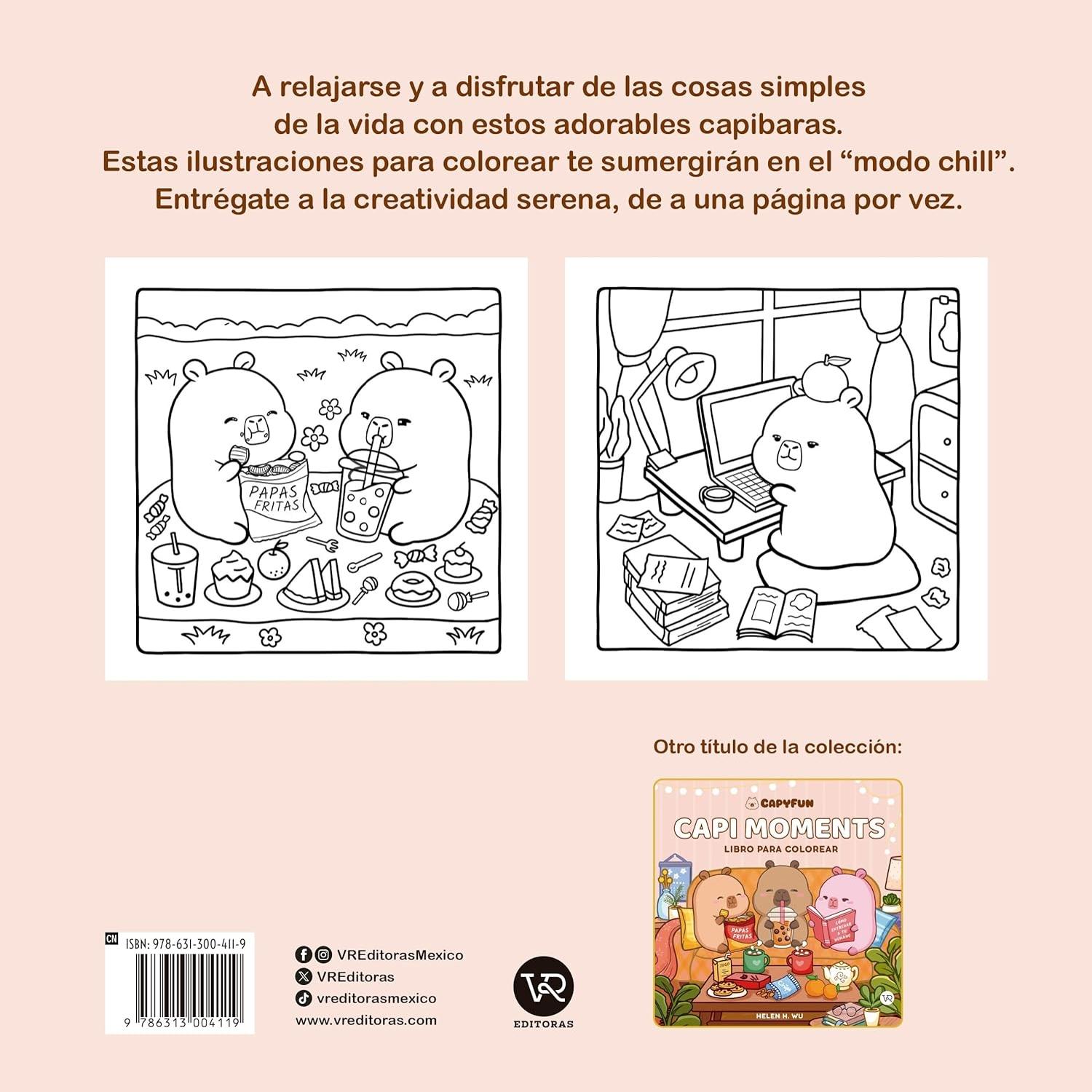 Descripción: A relajarse y a disfrutar de las cosas simples de la vida con estos adorables capibaras. Estas ilustraciones para colorear te sumergirán en el “modo chill”. Entrégate a la creatividad serena, de una página por vez.