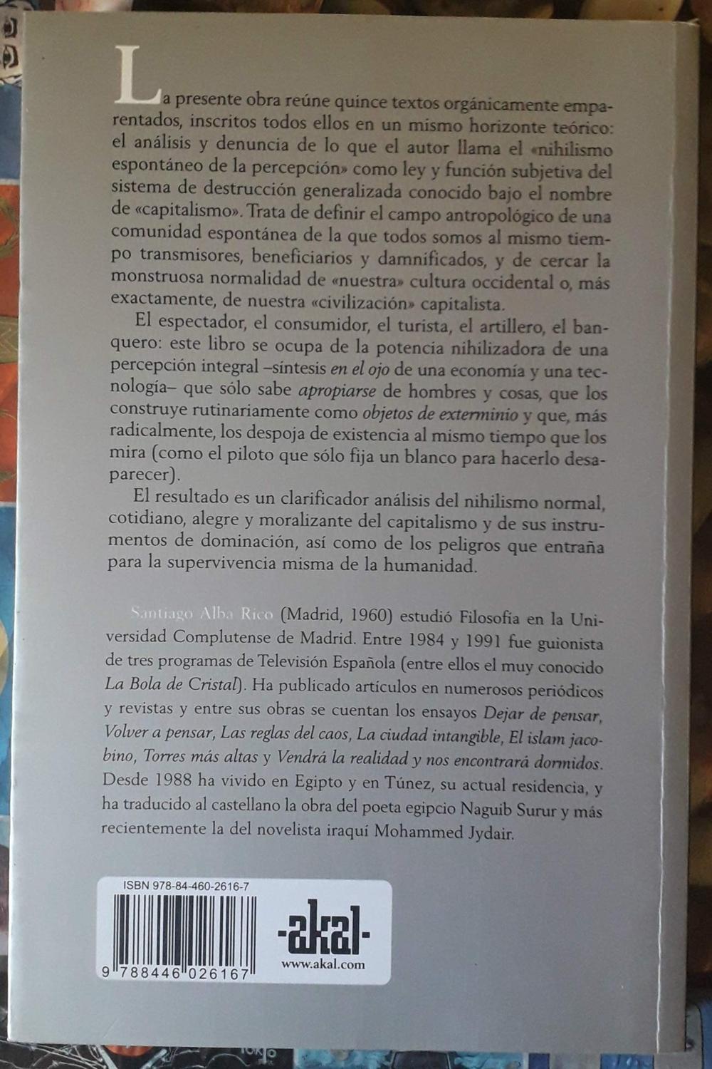 Descripción: Capitalismo y nihilismo constituye un clarificador análisis del nihilismo normal, cotidiano, alegre y moralizante del capitalismo y de sus instrumentos de dominación, así como de los peligros que entraña para la supervivencia misma de la humanidad.