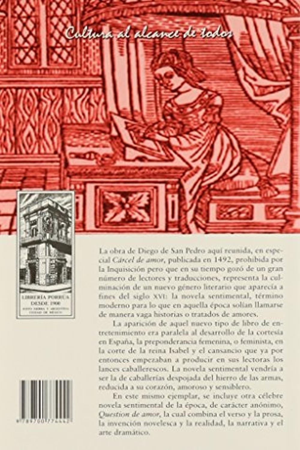 Descripción: La obra de Diego de San Pedro aquí reunida, en especial Cárcel de amor, publicada en 1492, prohibida por la Inquisición pero que en su tiempo gozó de un gran número de lectores y traducciones, representa la culminación de un nuevo género literario que aparecía a fines del siglo XVI: la novela sentimental, término moderno para lo que en aquella época solían llamarse de manera vaga historias o tratados de amores. La aparición de aquel nuevo tipo de libro de entretenimiento era paralela al desarrollo de la cortesía en España, la preponderancia femenina, o feminista, en la corte de la reina Isabel y el cansancio que ya por entonces empezaban a producir en sus lectoras los lances caballerescos. La novela sentimental vendría a ser la de caballerías despojada del hierro de las armas, reducida a su corazón, amoroso y sensiblero. En este mismo ejemplar, se incluye otra célebre novela sentimental de la época, de carácter anónimo, Questión de amor, la cual combina el verso y la prosa, la invención novelesca y la realidad, la narrativa y el arte dramático.