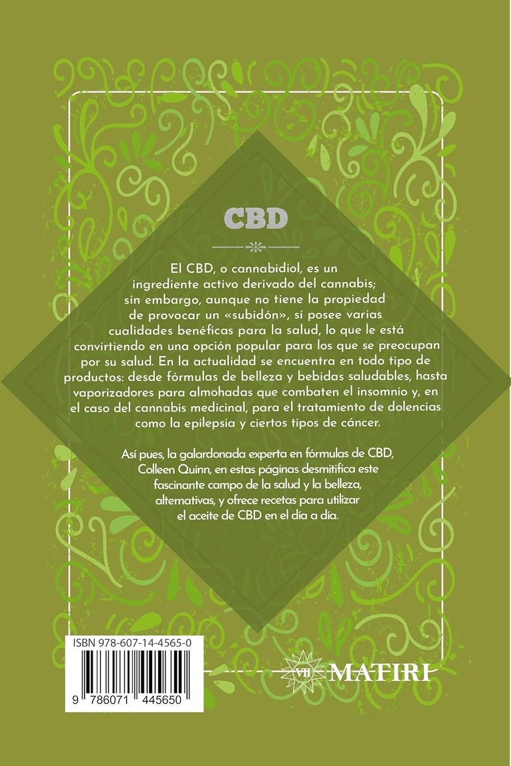 Descripción: El CBD, o cannabidiol, es un ingrediente activo derivado del cannabis; sin embargo, aunque no tiene la propiedad de provocar un «subidón», sí posee varias cualidades benéficas para la salud, lo que le está convirtiendo en una opción popular para los que se preocupan por su salud. En la actualidad se encuentra en todo tipo de productos: desde fórmulas de belleza y bebidas saludables, hasta vaporizadores para almohadas que combaten el insomnio y, en el caso del cannabis medicinal, para el tratamiento de dolencias como la epilepsia y ciertos tipos de cáncer. Así pues, la galardonada experta en fórmulas de CBD, Colleen Quinn, en estas páginas desmitifica este fascinante campo de la salud y la belleza, alternativas, y ofrece recetas para utilizar el aceite de CBD en el día a día.