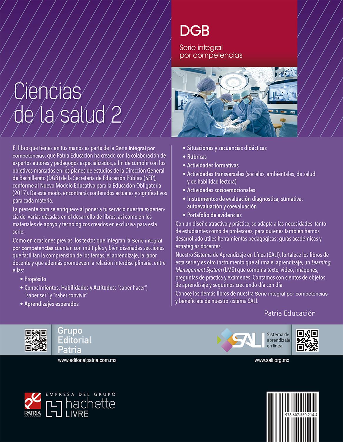 Descripción: Uno de los temas clave en la agenda pública nacional es el tema del autocuidado de la salud. Esta obra tiene la intención de ser una guía para los jóvenes adolescentes en esta materia. Brinda información confiable y valiosa con respecto a temas de relevancia como la farmacología, la microbiología y la parasitología de una manera comprensible para el estudiante. También se presentan temas de conductas de riesgo y cómo prevenirlas, así como de primeros auxilios y prevención de accidentes, temas que son de inestimable valor para el adolescente. También cuenta con los valiosos materiales de apoyo en sali, plataforma electrónica de ayuda para el estudiante.